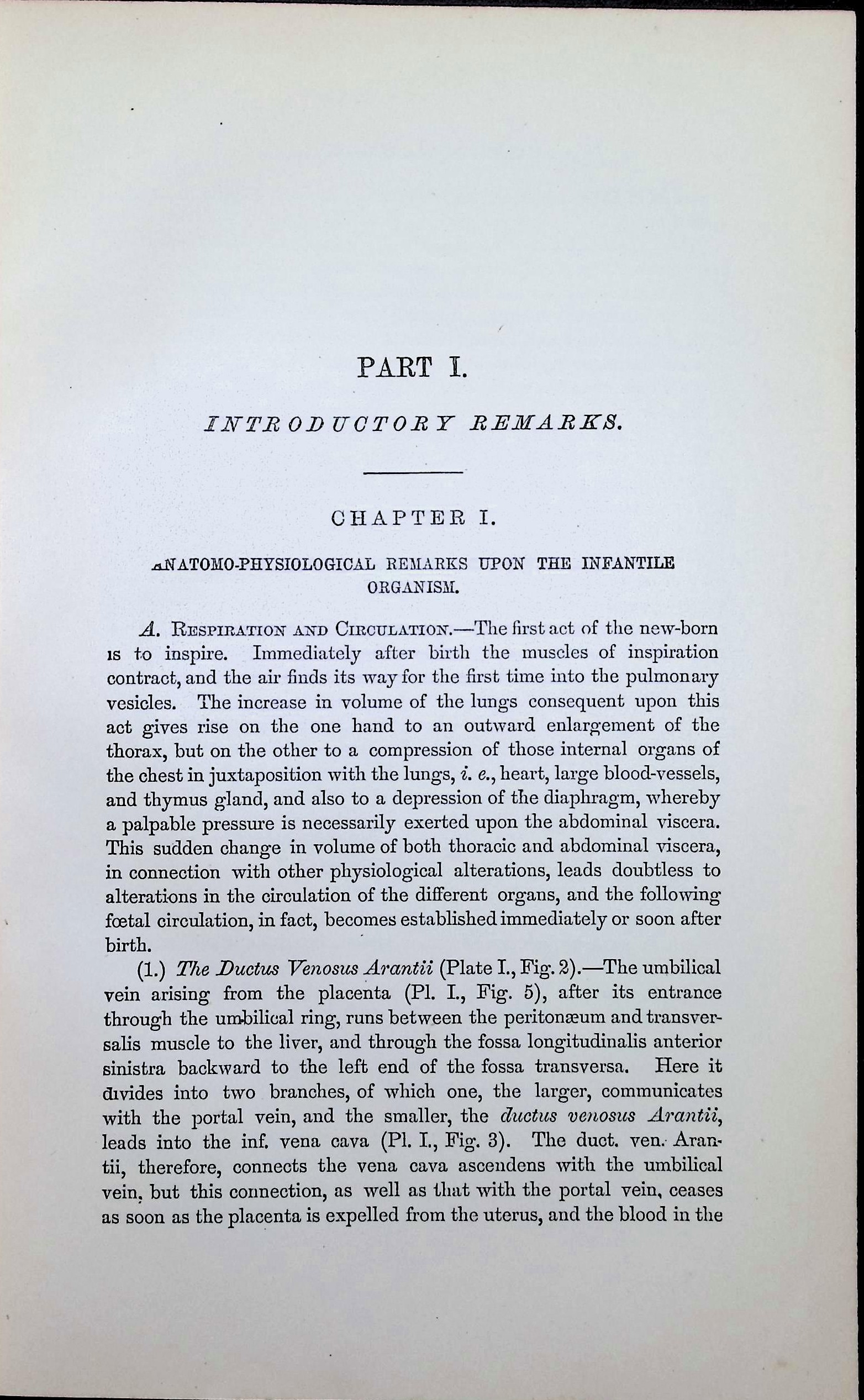 “Immediately after birth the muscles of inspiration contract, and the air finds its way for the first time into the pulmonary vesicles… This sudden change in volume of both thoracic and abdominal viscera leads doubtless to alterations in the circulation of the different organs.” (Part I, Chapter I)