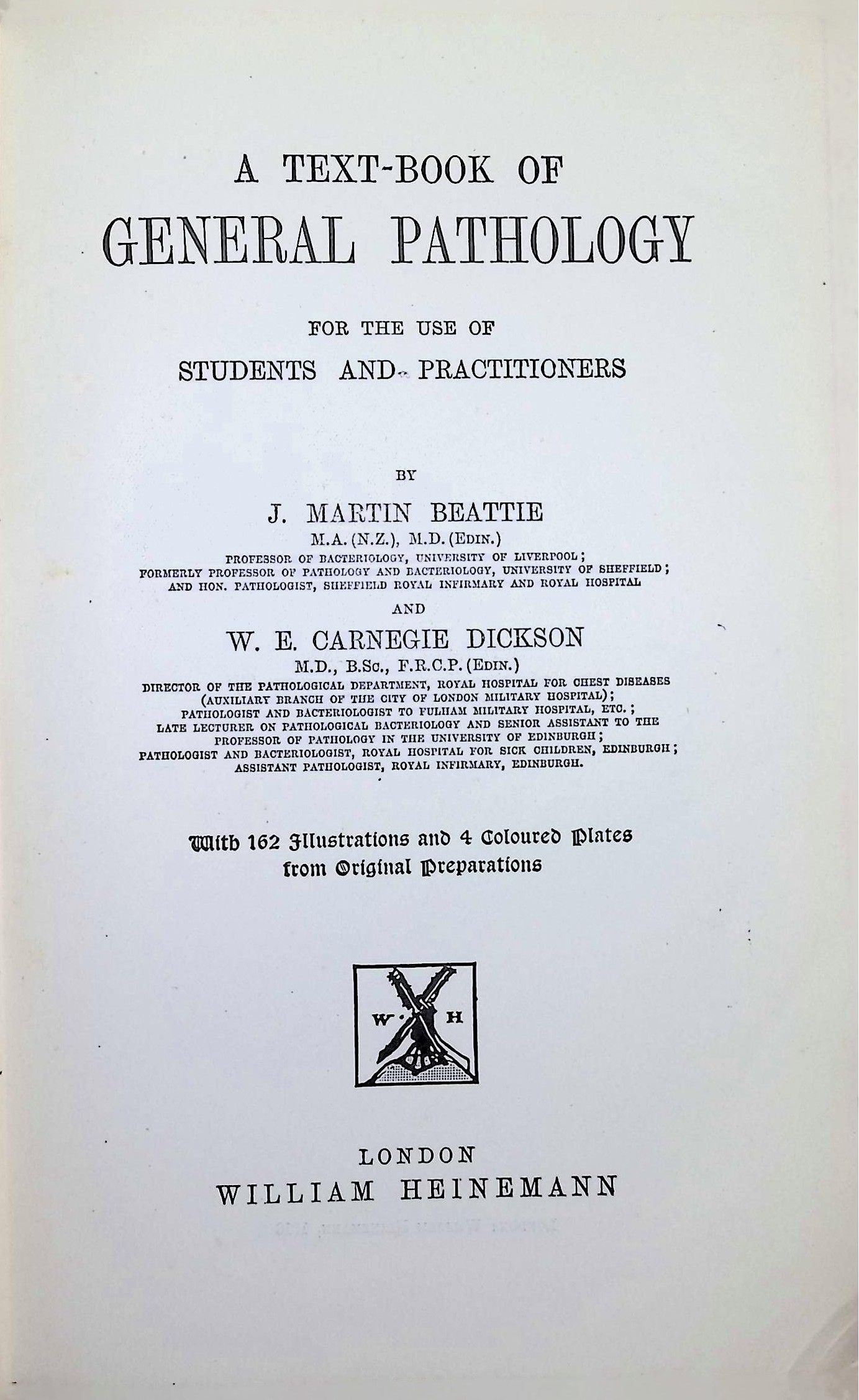 This richly illustrated pathology textbook by Beattie and Dickson captures the evolving medical understanding of disease in the early 20th century. It presents foundational knowledge on inflammation, degeneration, necrosis, circulatory disturbances, and infectious diseases as viewed through the lens of microscopy and gross pathology. The inclusion of colored plates and black-and-white photographic documentation of pathological specimens makes this volume both instructional and visually striking.