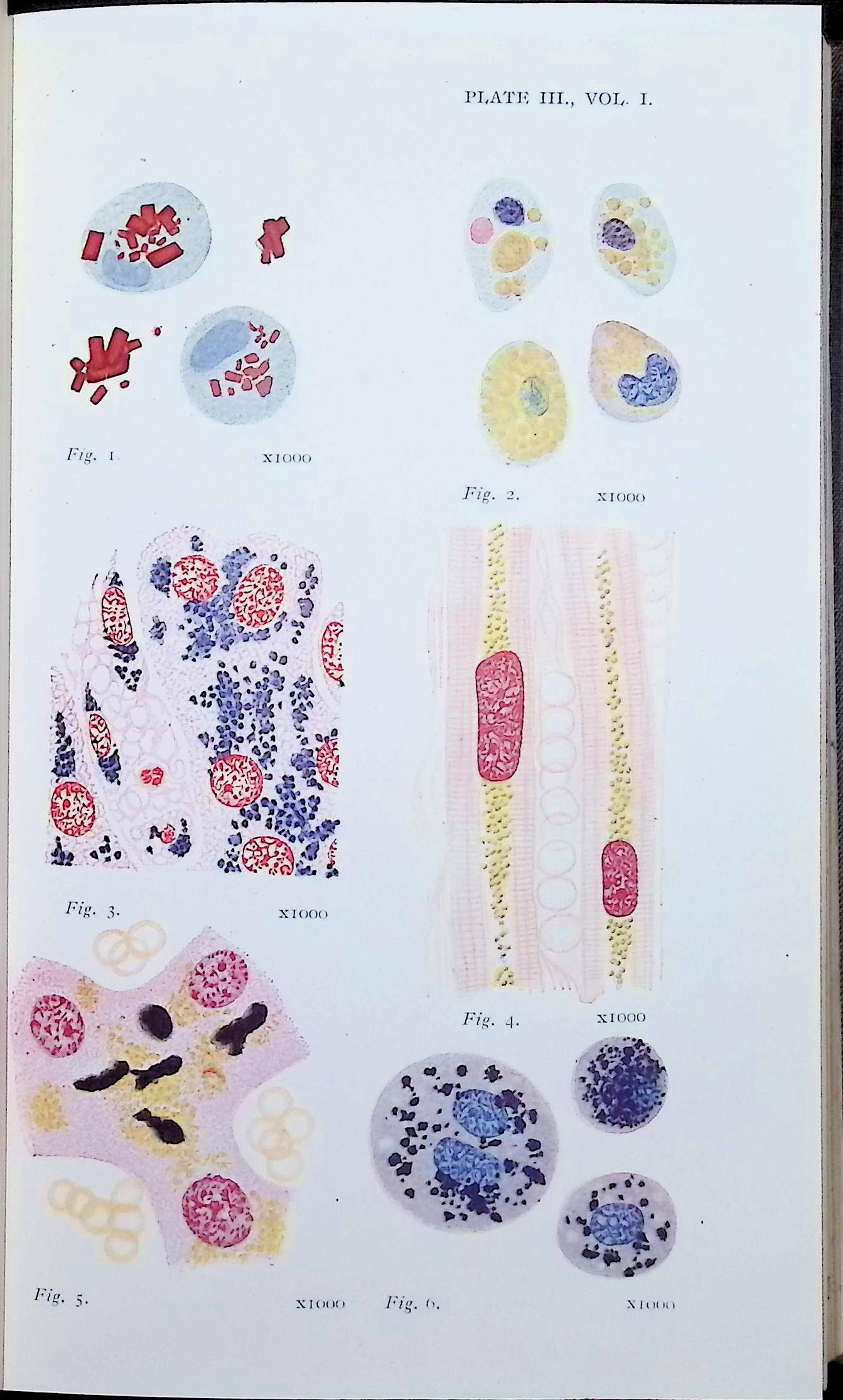 Plate III includes hand-colored illustrations of haematoidin crystals, bile-stained phagocytes, and cardiac atrophy.