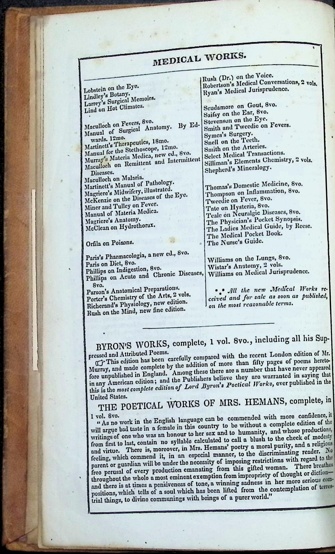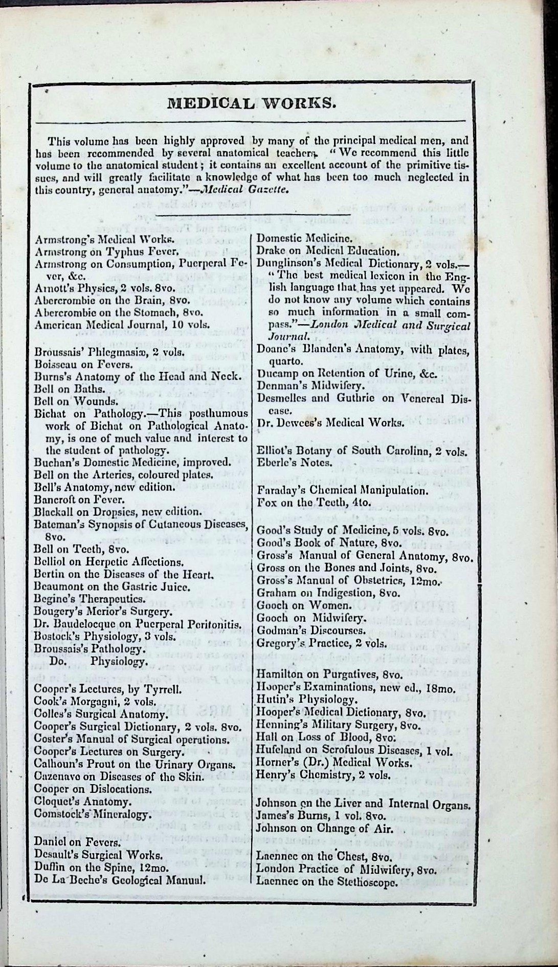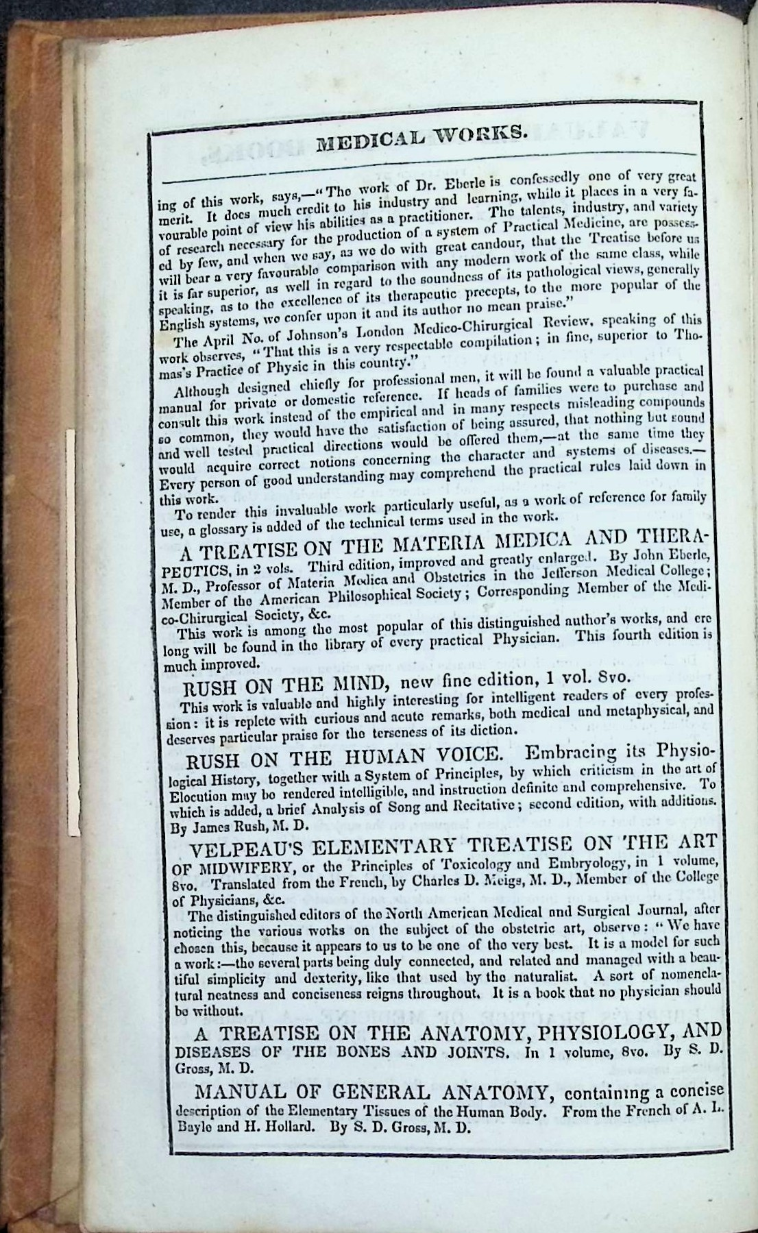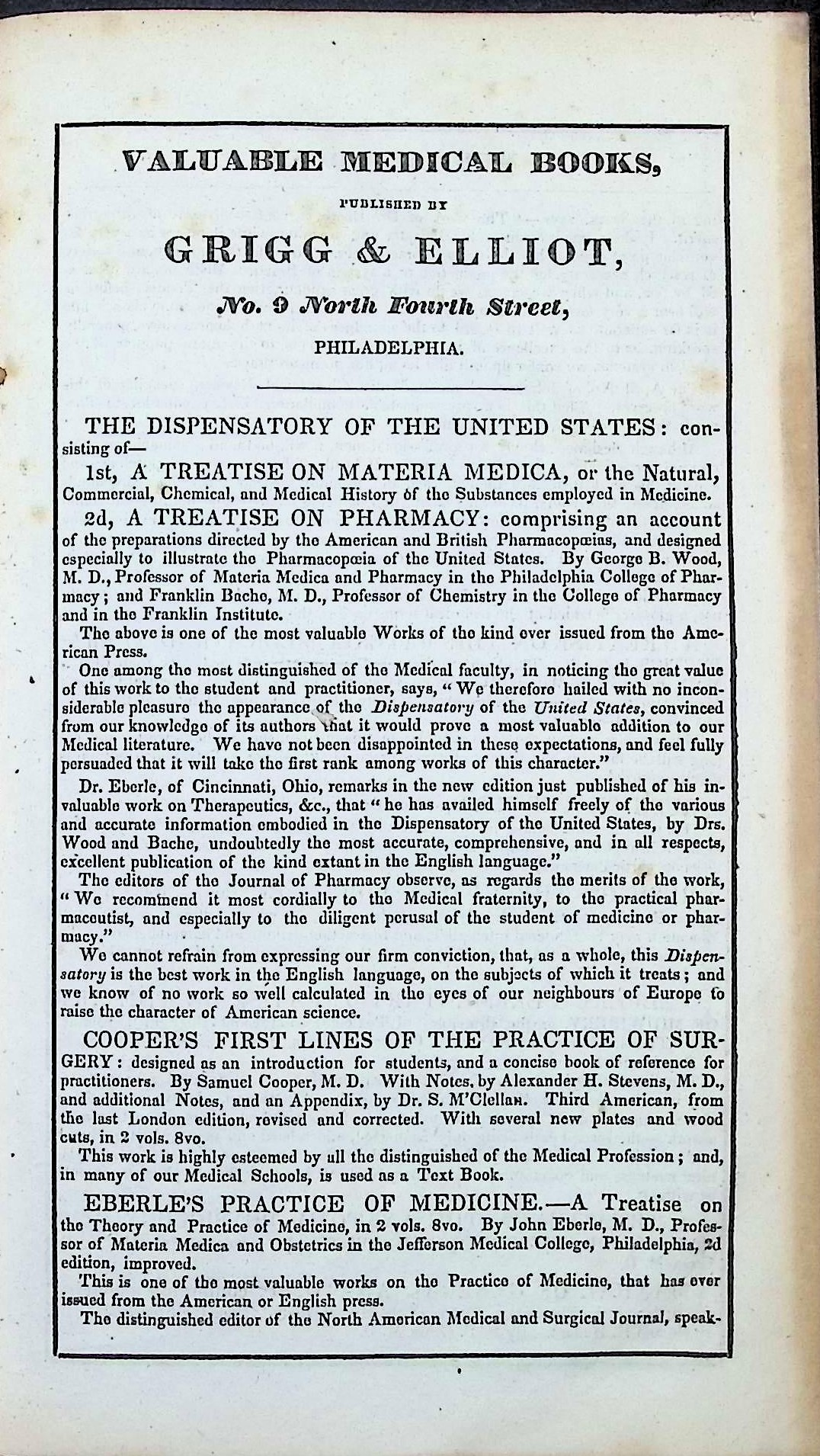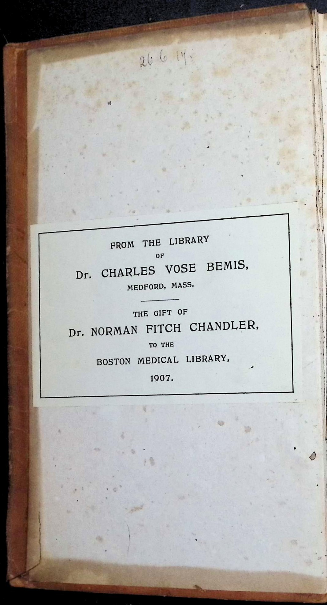 This copy bears the signature of Dr. Charles Vose Bemis of Medford, Massachusetts, and a gift plate from Dr. Norman Fitch Chandler to the Boston Medical Library dated 1907. It retains the publisher’s catalog of “Valuable Medical Books” at the front—a snapshot of leading American medical titles of the 1830s.