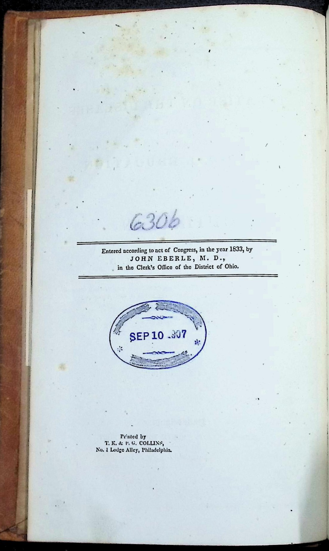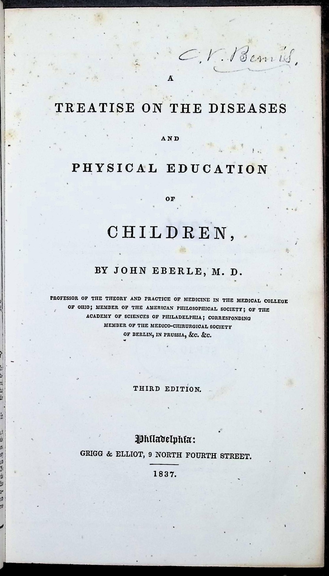 Third edition of A Treatise on the Diseases and Physical Education of Children, published in 1837 by Grigg & Elliot, Philadelphia. This influential early American medical text represents one of the first works devoted solely to the health and development of children. John Eberle, professor at the Medical College of Ohio, was among the earliest American physicians to publish systematic textbooks on pathology and therapeutics. This volume combines detailed clinical discussion with guidance on nutrition, hygiene, and early childhood management, forming a cornerstone of nineteenth-century pediatric medicine.