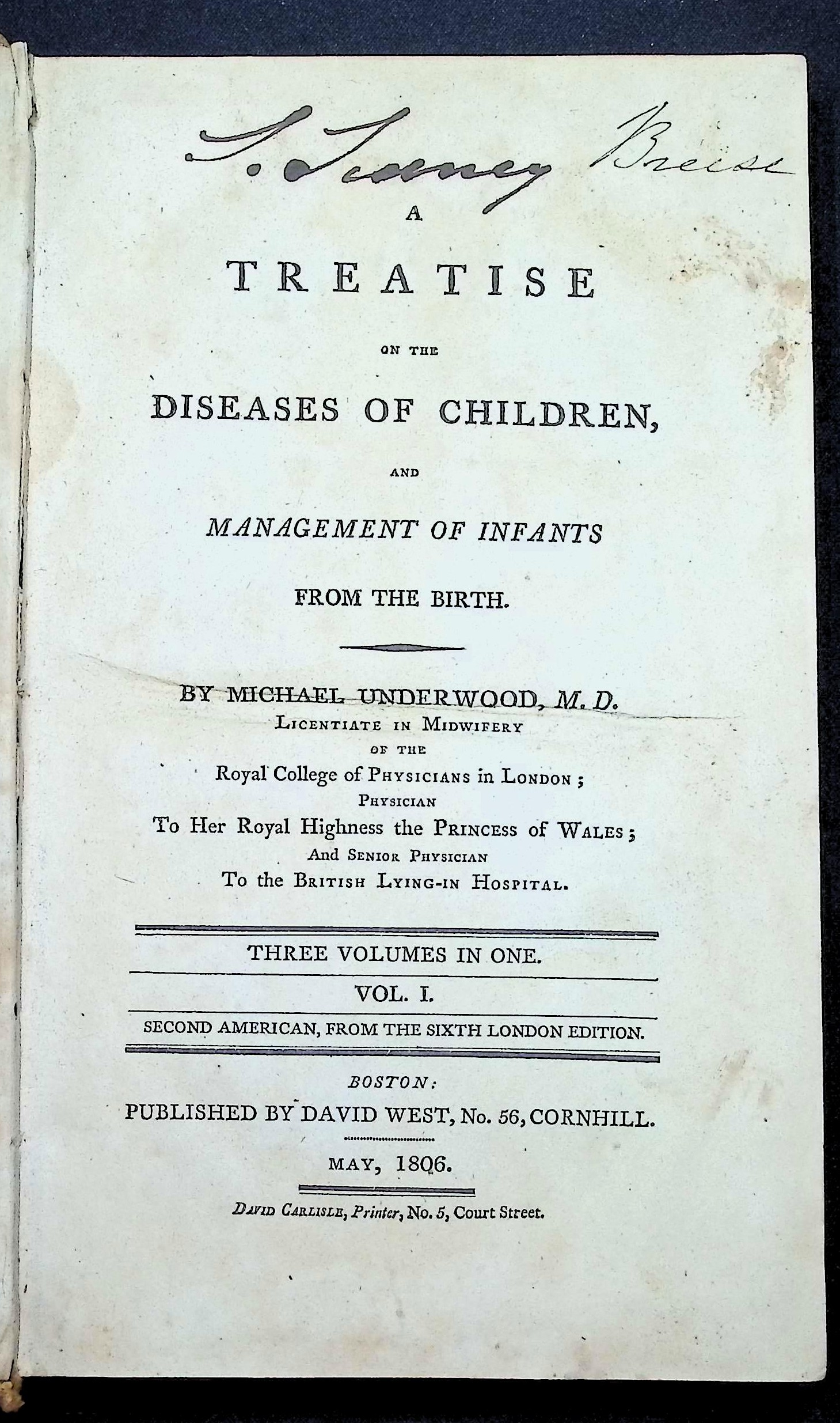 This 1806 Boston edition of Underwood’s Treatise on the Diseases of Children represents a landmark in the development of pediatrics. Originally published in 1784, Underwood’s work was the first systematic and comprehensive medical text dedicated solely to childhood diseases.