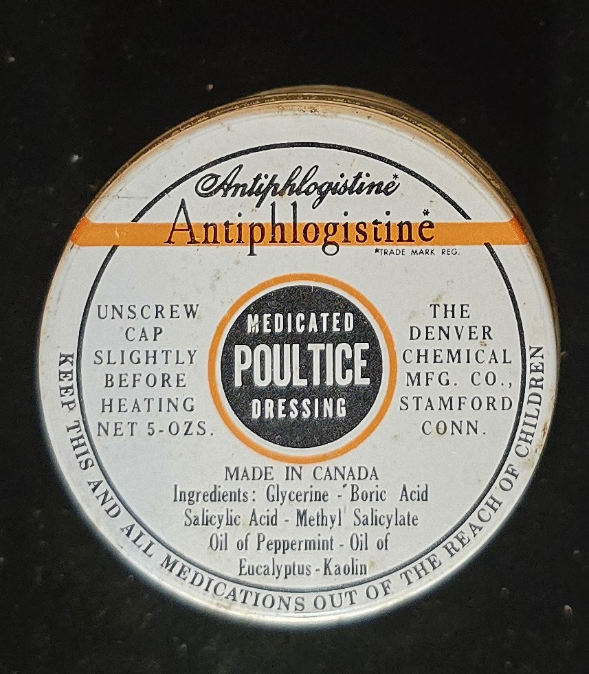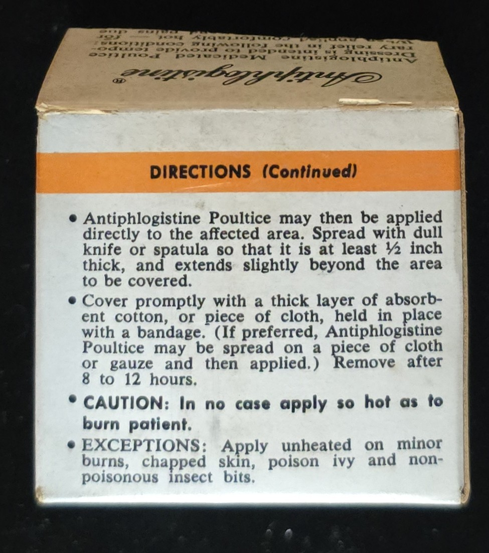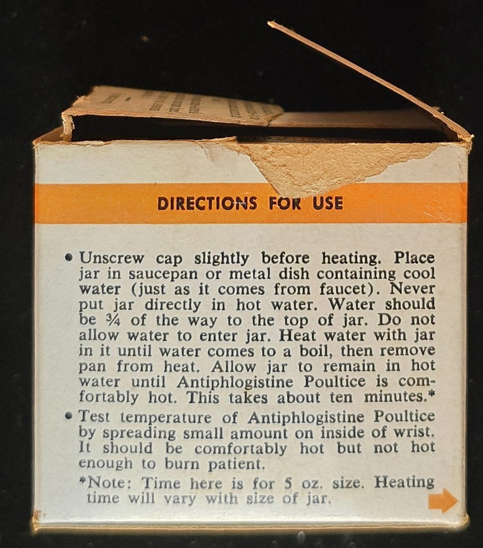 Vintage jar and box of Antiphlogistine poultice with ingredients and instructions