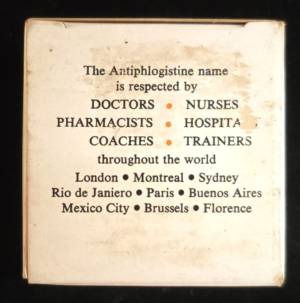 Antiphlogistine was first developed in the late 1800s and became a household name well into the 1940s–50s. Before modern NSAIDs, poultices like this were used to draw out “congestion” or “inflammatory toxins.” Its maker, The Denver Chemical Mfg. Co., marketed it to doctors, nurses, pharmacists, hospitals, coaches, and trainers—a wide audience in both professional and home medical settings.