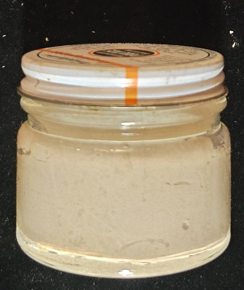 Box shows edge wear, some discoloration, and a missing corner tab. Glass jar and label are intact, with full contents remaining. Lid shows light oxidation. Exceptionally well-preserved for a product over 70 years old.