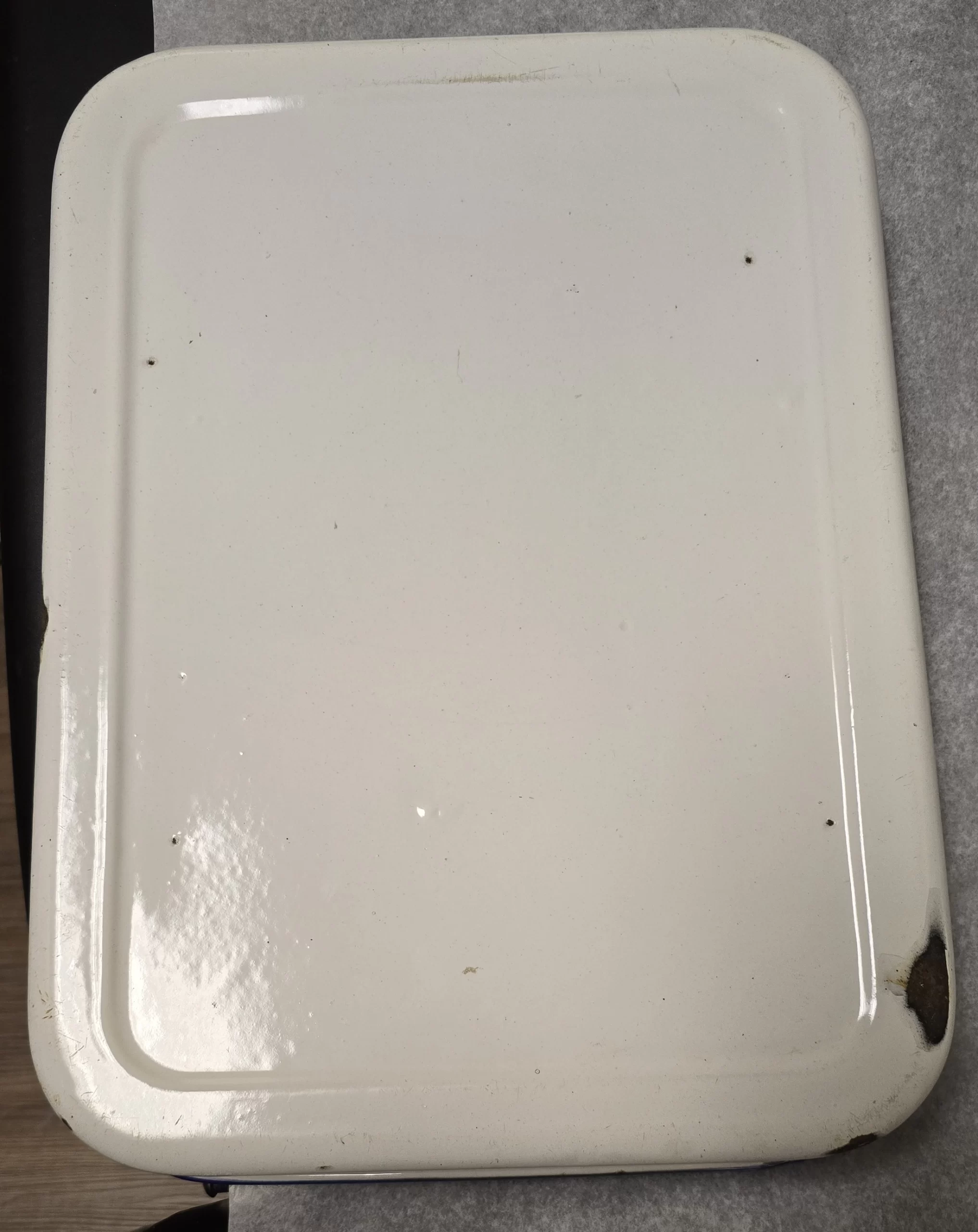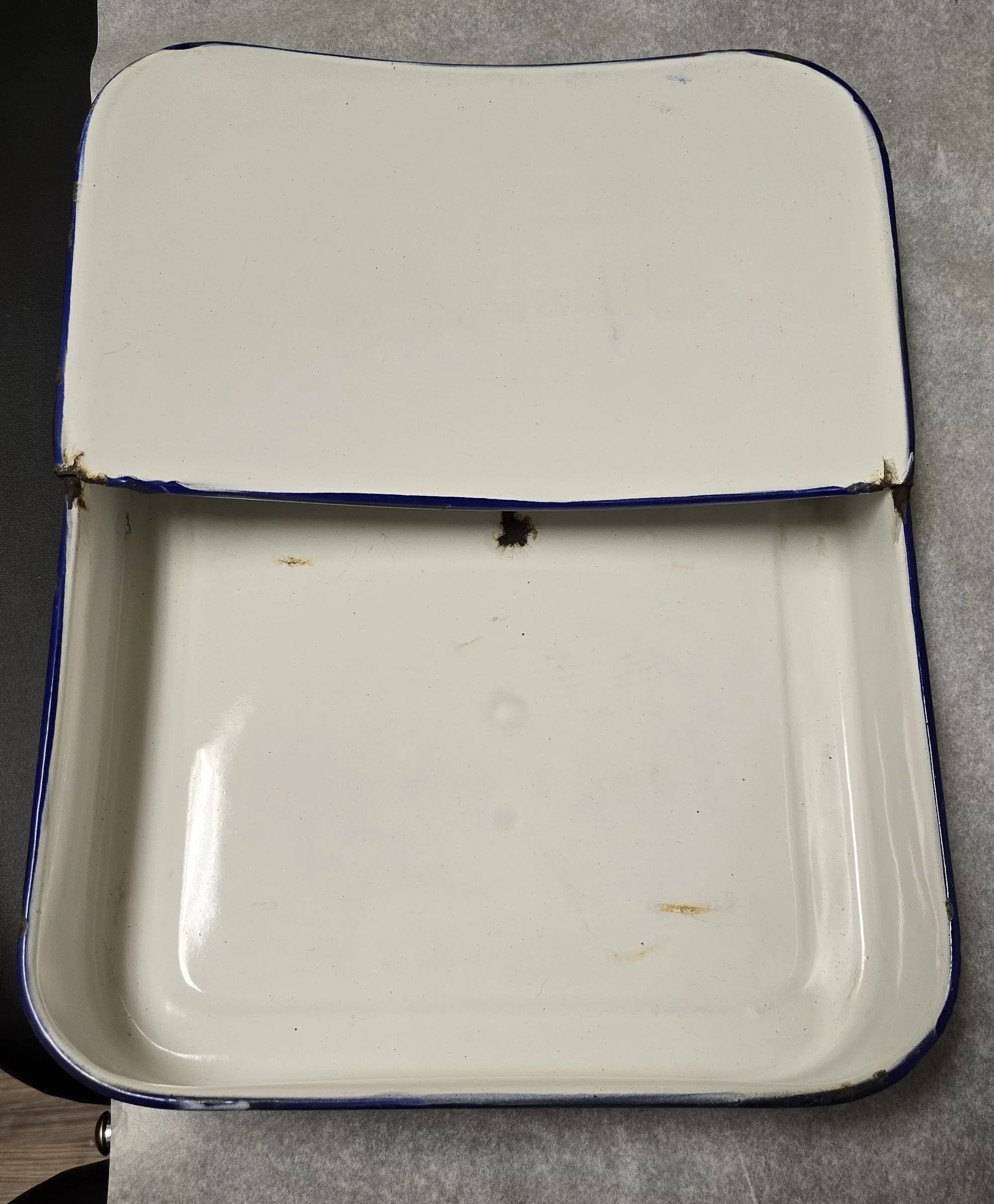 The enamel pans show chipping, wear at the seams, and areas of exposed metal — common in vintage enamelware that saw repeated sterilization and handling.