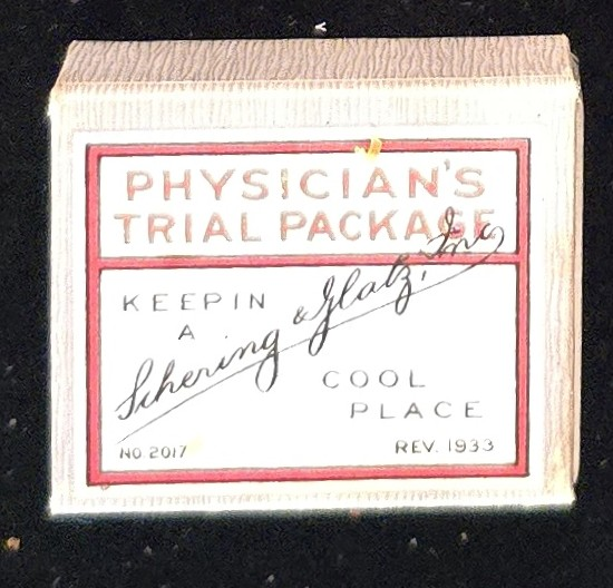 This small box contains a Physician’s Trial Package of Anusol Hemorrhoidal Suppositories, produced by Schering & Glatz, Inc. in 1933. Inside are three tinfoil-wrapped suppositories with an original printed insert, offering physicians a free sample to dispense to patients.