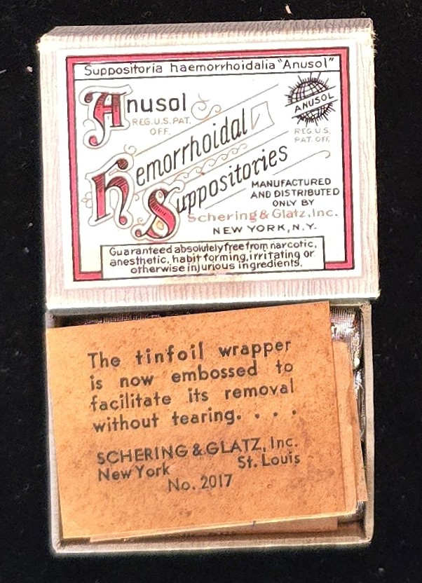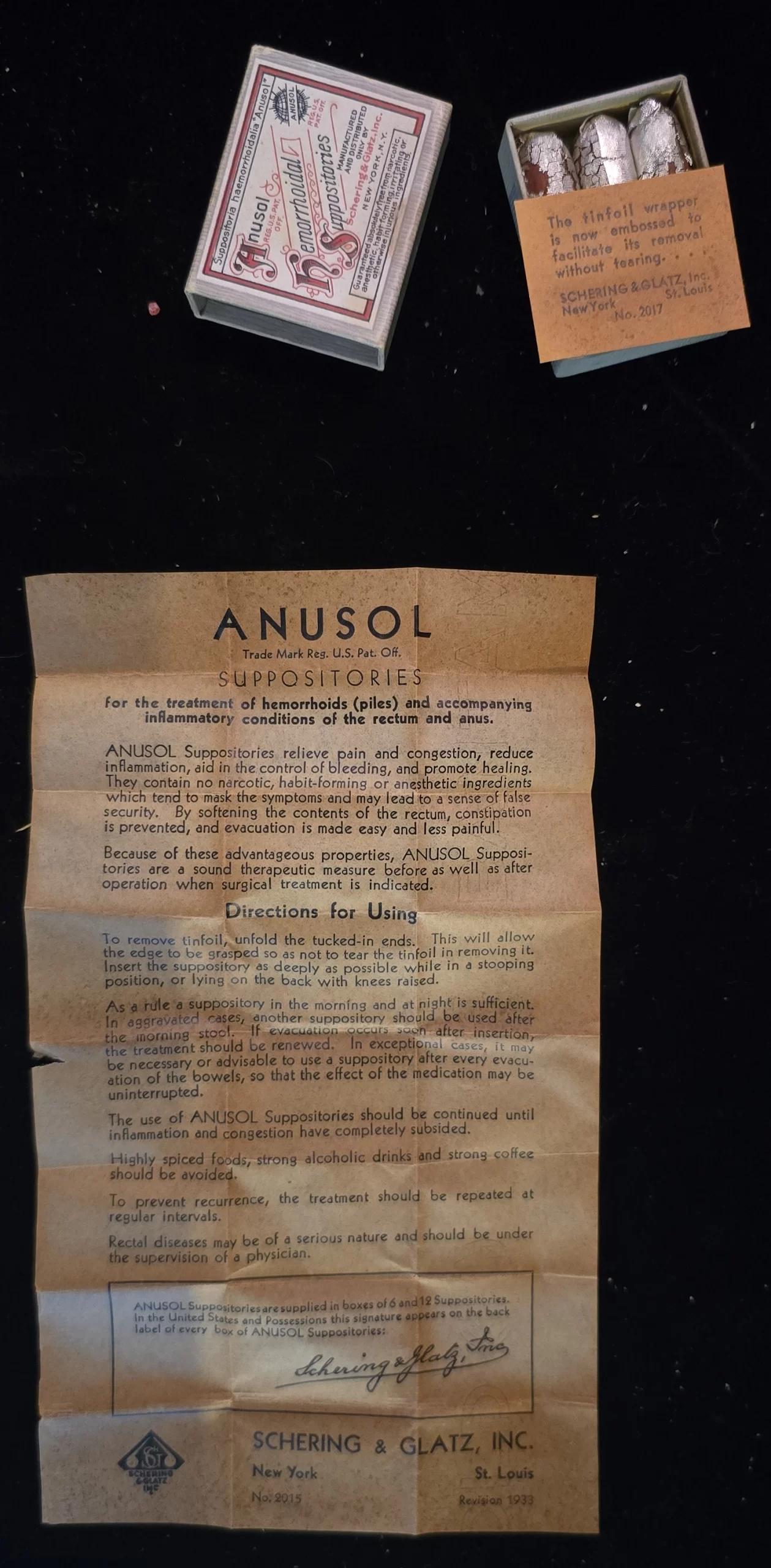 Vintage 1933 Anusol Hemorrhoidal Suppositories Physician’s Trial Package, box, foil-wrapped suppositories, and instruction insert by Schering & Glatz.