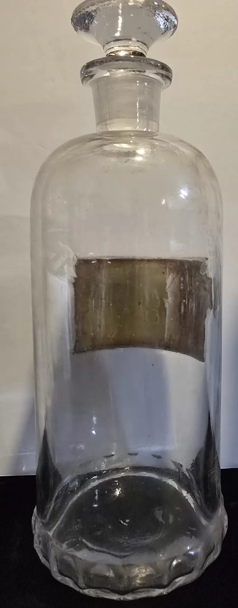 The jar remains intact with no cracks or chips. Its ground glass stopper is present and functional. The painted/applied label shows minor wear and age-toning but retains strong legibility. The interior glass has residue and light clouding consistent with former use.