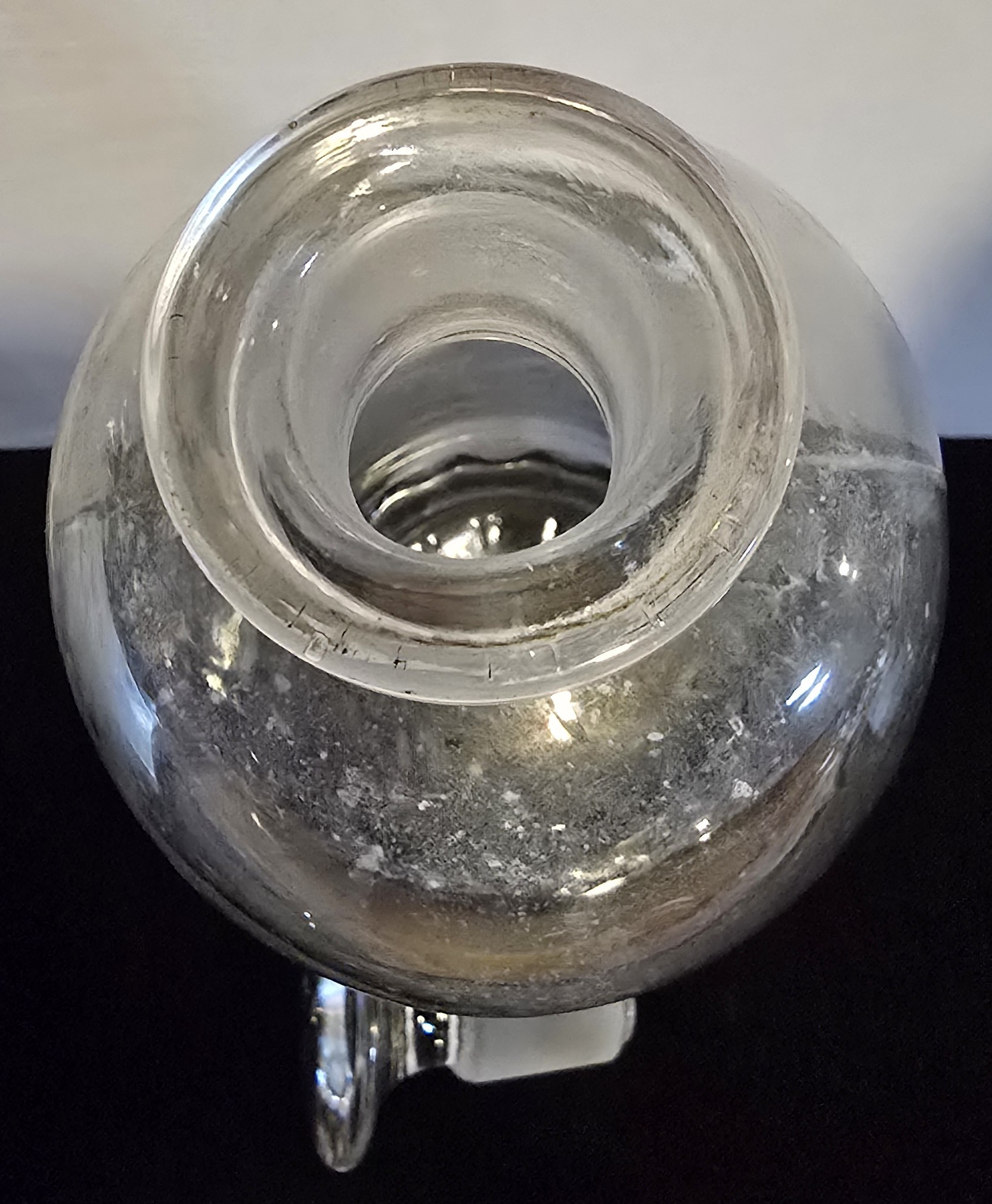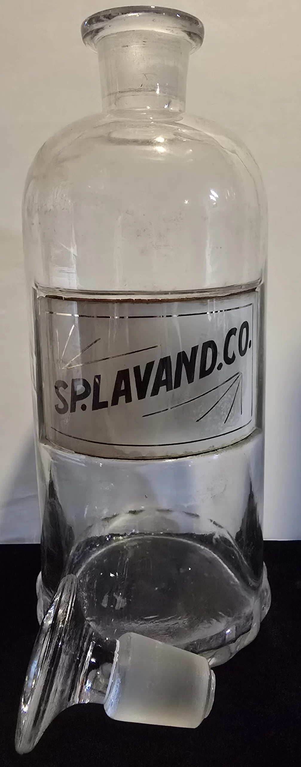 This antique apothecary jar is boldly labeled SP. LAVAND. CO., an abbreviation for Spiritus Lavandulae Compositus (Compound Spirit of Lavender). Hand-blown with a ground glass stopper, it was part of the standard fittings of 19th and early 20th century pharmacies.