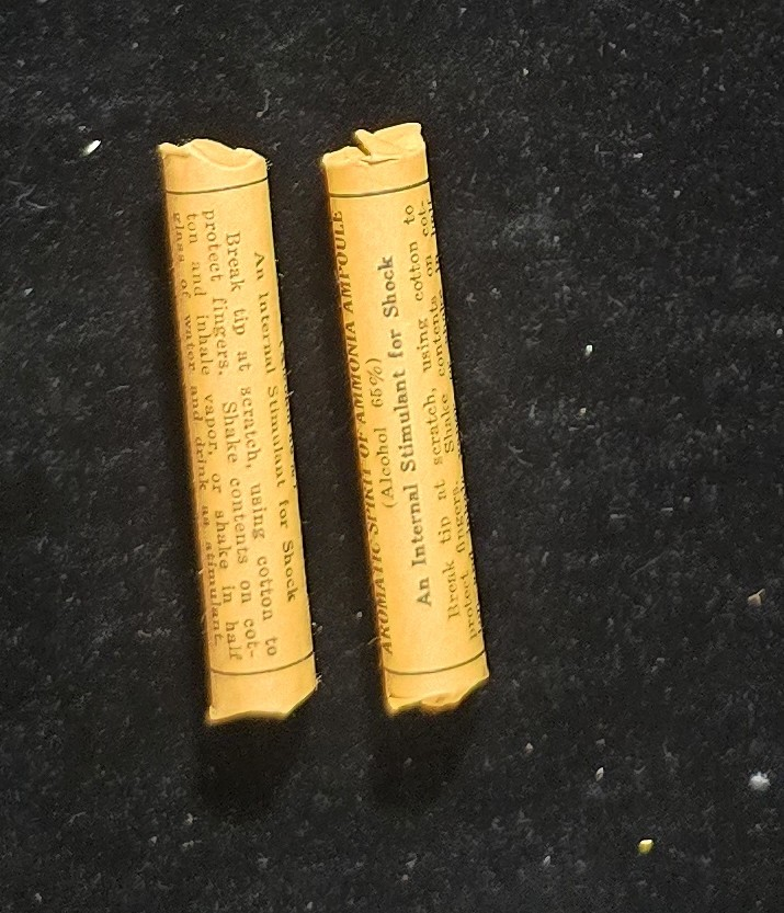 These sealed yellow-paper-wrapped aromatic spirit of ammonia ampoules were manufactured by Mine Safety Appliances Co., a company better known for gas masks, respirators, and industrial safety gear. Each ampoule contains 2 cc of a 66% alcohol-based ammonia solution, intended for emergency treatment of shock, collapse, or fainting.