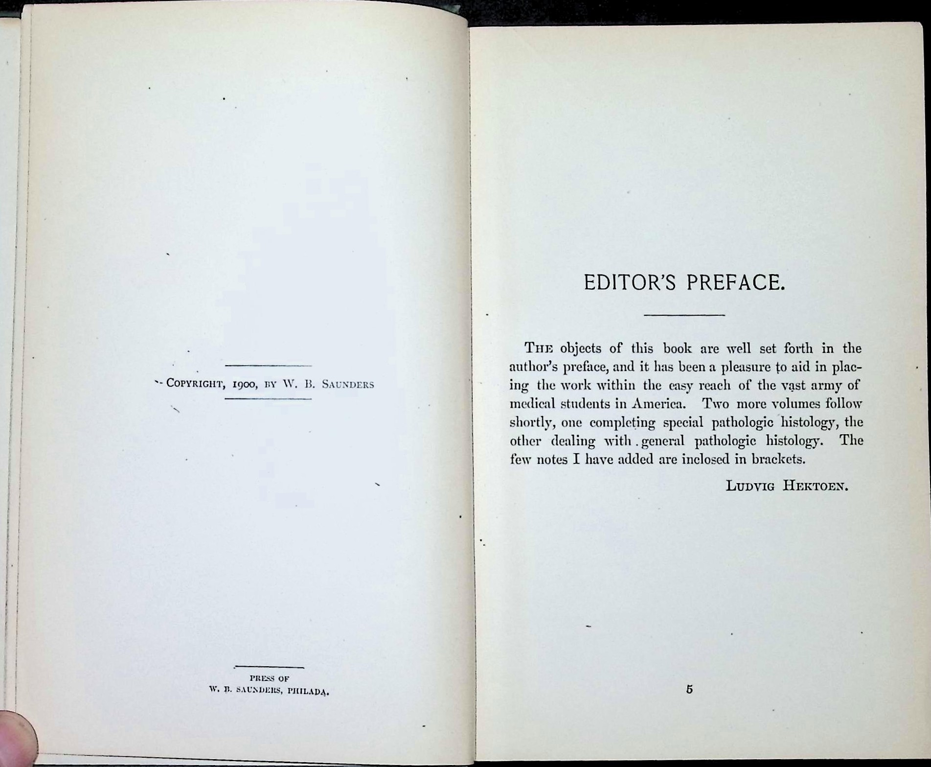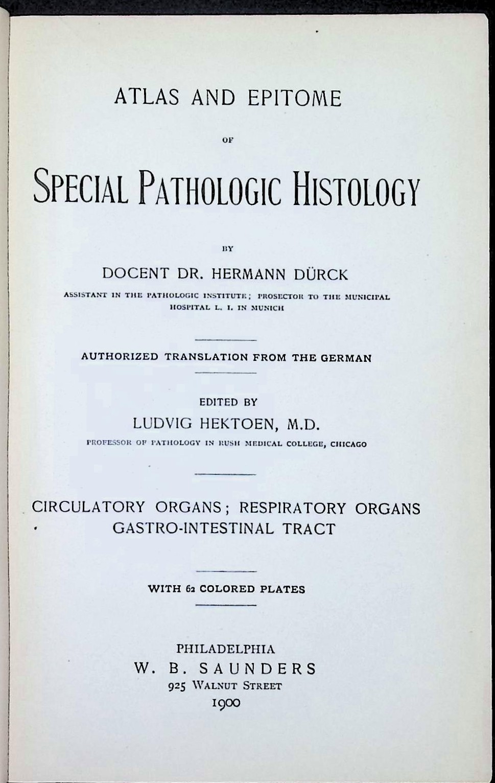 Published in 1900 by W. B. Saunders of Philadelphia, Atlas and Epitome of Special Pathologic Histology is an authorized English translation of Hermann Dürck’s German work, edited for American audiences by Ludvig Hektoen. The volume focuses on diseases of the circulatory system, respiratory organs, and gastrointestinal tract, presenting pathological changes through detailed text paired with finely executed color plates.