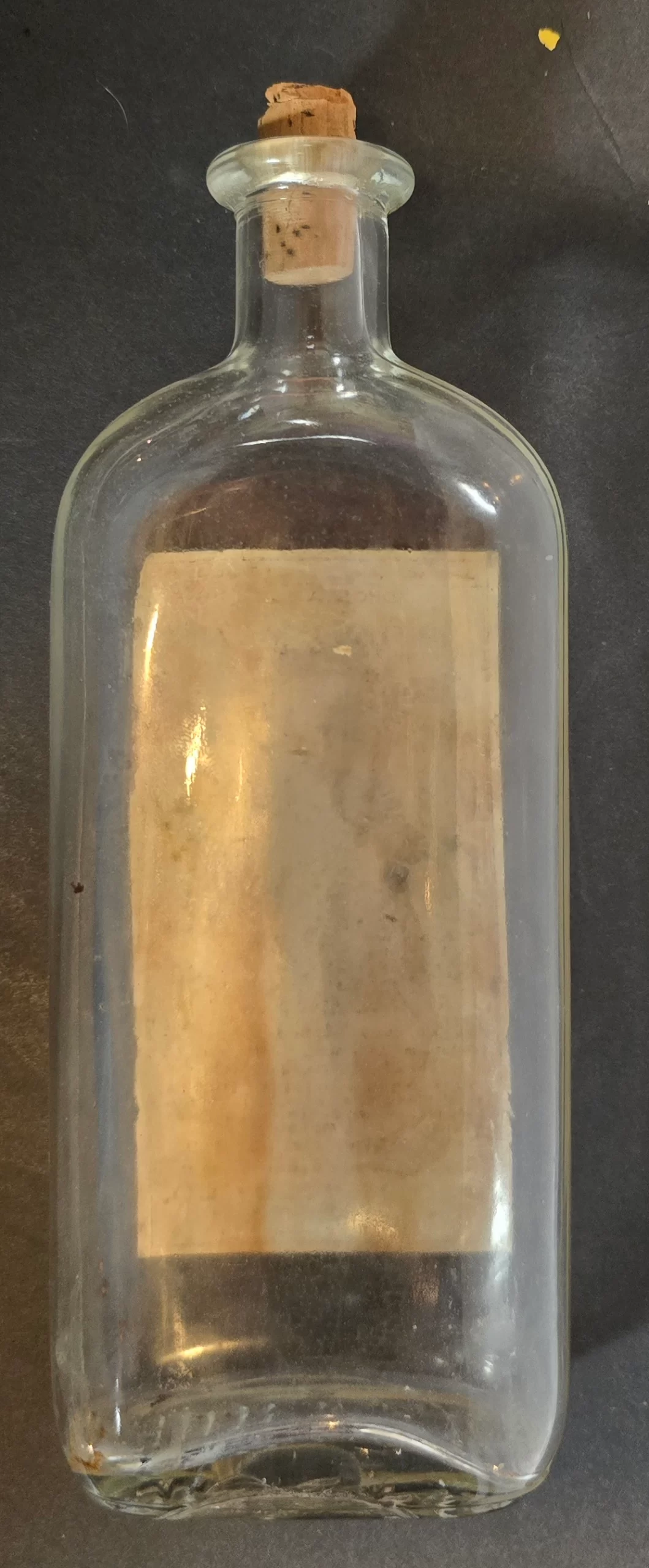Clear glass bottle with original cork in place. Paper label present and still legible, with mild browning, corner wear, and darkening/ink rub especially in the center text block. Glass is clean and intact with no obvious cracks or major chips. Back label panel on this example is blank/washed (label either missing or fully browned). Overall very displayable early physician’s prescription bottle from Louisville, Kentucky.