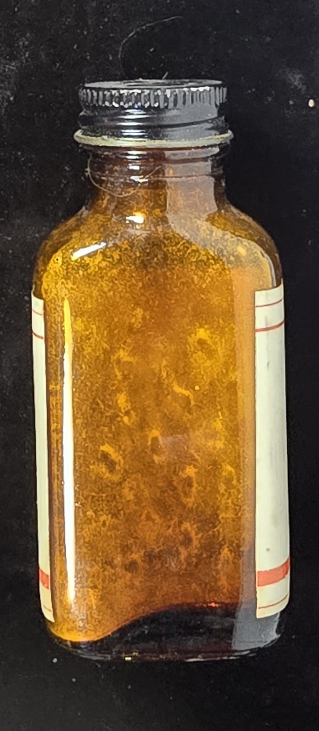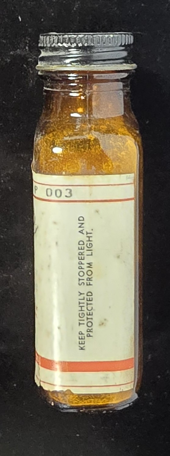 Good overall. The amber bottle remains clear with intact threaded metal cap and full labeling. Minor staining and label toning are present, along with light surface wear. Faint oxidation visible around the cap rim. No cracks or structural damage noted.