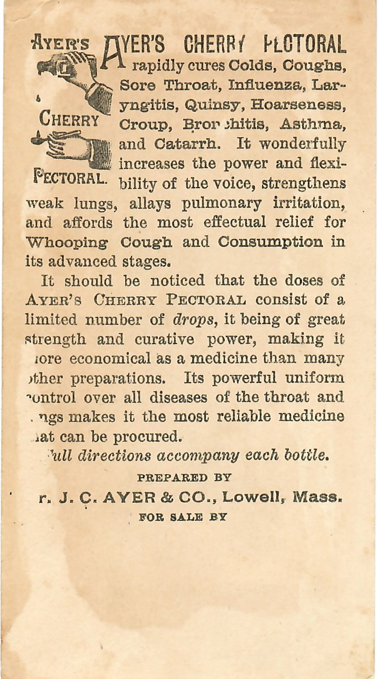 “Ayer’s Cherry Pectoral rapidly cures Colds, Coughs, Sore Throat, Influenza, Laryngitis, Quinsy, Hoarseness, Croup, Bronchitis, Asthma, and Catarrh… affording the most effectual relief for Whooping Cough and Consumption in its advanced stages.”