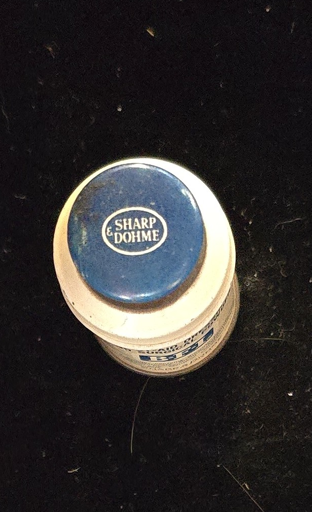 The minimalist typography and blue-white enamel design reflect the mid-century aesthetic of Sharp & Dohme packaging, suggesting production from the 1940s–1950s, shortly after the company’s merger with Merck & Co.