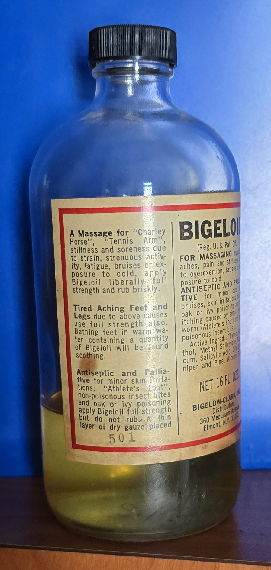 This is a vintage 16-ounce glass bottle of Bigeloil, a topical liniment distributed by Bigelow-Clark, Inc. of Elmont, New York. Labeled for use in massaging sore muscles and relieving aches, it was also advertised as an antiseptic and palliative for minor cuts, bruises, skin irritation, athlete’s foot, and insect bites. Active ingredients include menthol, methyl salicylate, thymol, capsicum, salicylic acid, juniper and pine oils, and 75% alcohol.