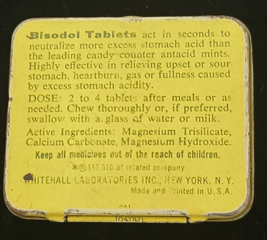 Whitall Laboratories, originally tied to glass and pharmaceutical supply manufacturers, marketed Bisodol widely through pharmacies and general stores. Surviving tins offer a glimpse into mid-century consumer medicine: inexpensive, practical, and aggressively advertised as a simple fix for common discomforts.
