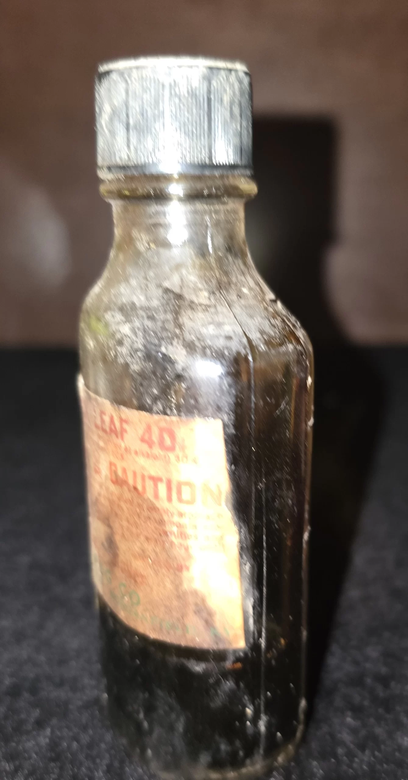 Amber bottle of Black Leaf 40 nicotine insecticide with poison warning label