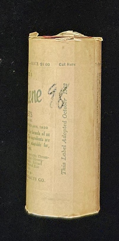 Cylindrical paper roll with original printed wrapper intact, though yellowed and brittle with age. Top and bottom edges worn; tablets not present.