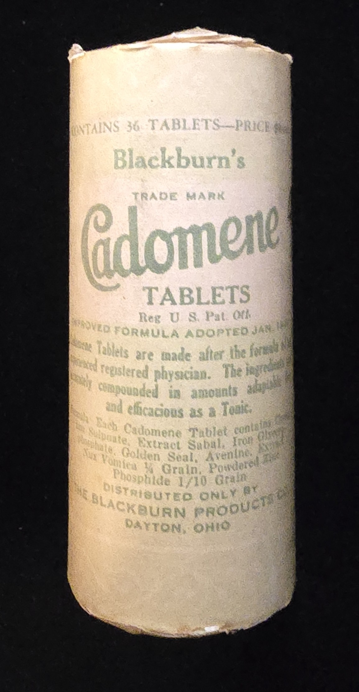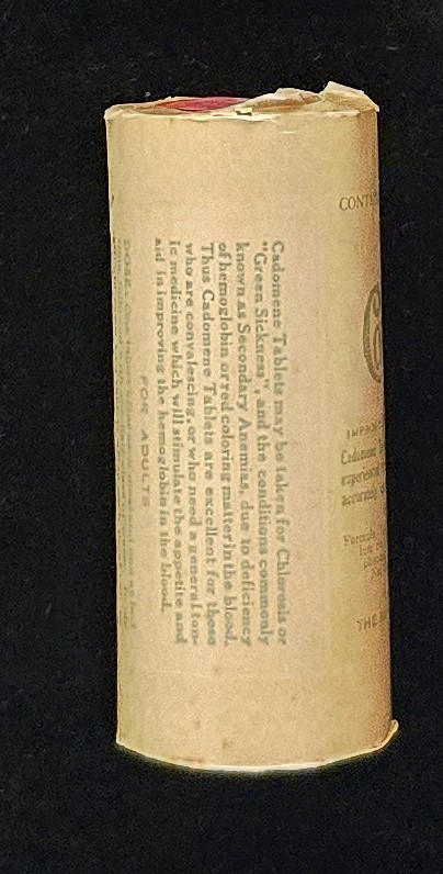 This package once contained 36 Cadomene Tablets, produced by The Blackburn Products Co. of Dayton, Ohio. Priced at $1.00, these tablets were marketed as a tonic and claimed to be “scientifically compounded” after the formula of a registered physician.