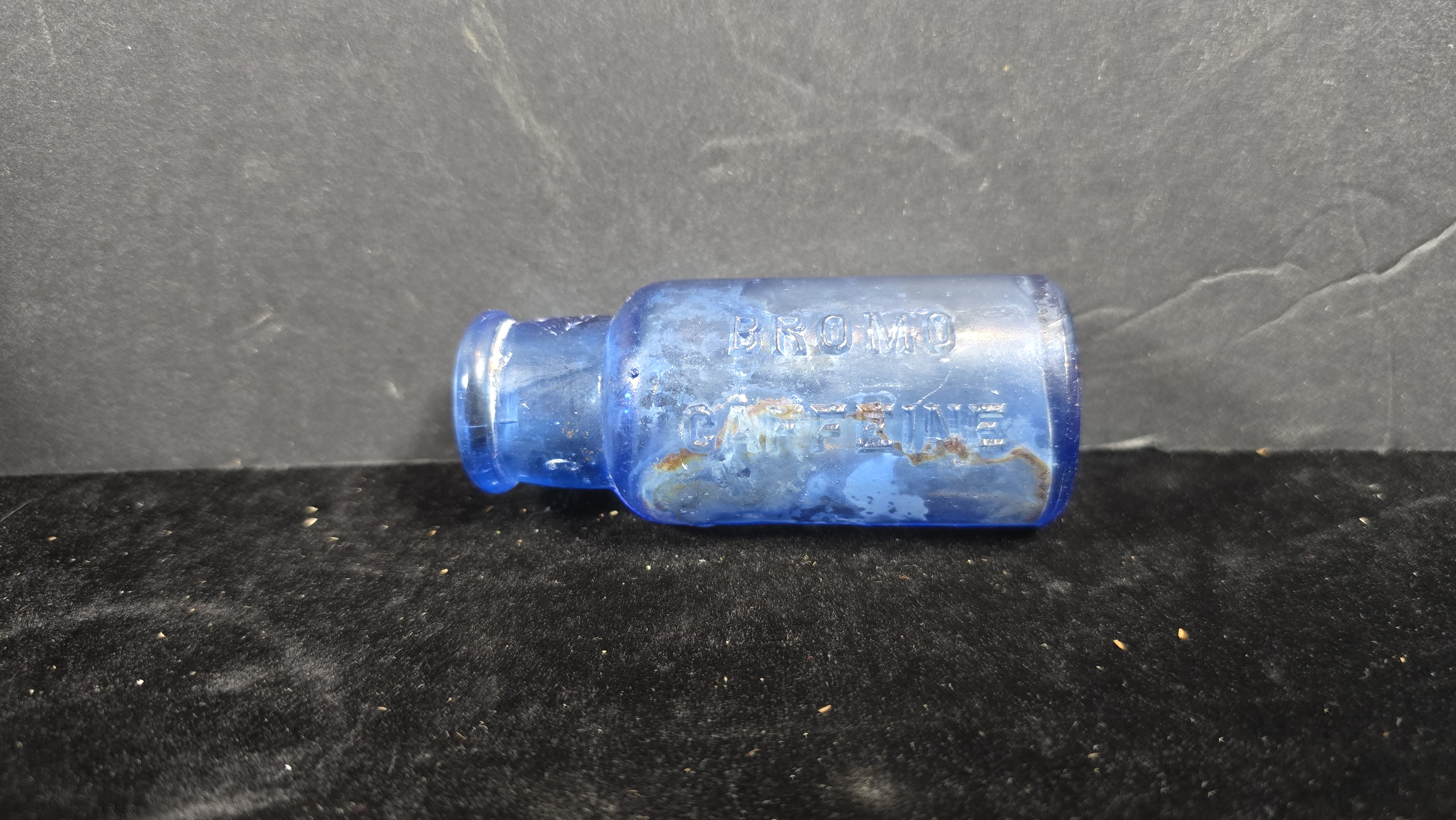 This is an early 20th-century Bromo Caffeine bottle, manufactured in cobalt blue glass and embossed with the product name. The bottle was originally intended to contain a bromide-based stimulant preparation combining bromides (sedative and anticonvulsant agents) with caffeine, a formulation commonly marketed for the treatment of headaches, nervousness, and “brain fatigue.”