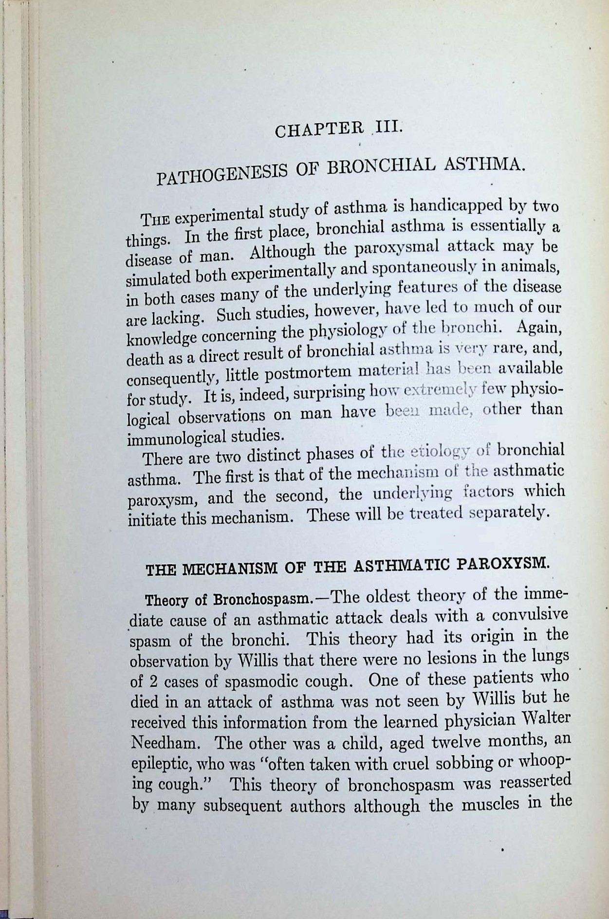 “The experimental study of asthma is handicapped by two things. In the first place, bronchial asthma is essentially a disease of man… Such studies, however, have led to much of our knowledge concerning the physiology of the bronchi.”