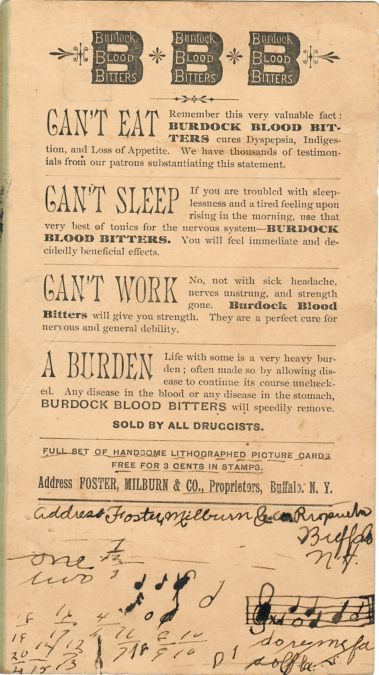 “Burdock Blood Bitters cures dyspepsia, indigestion, and loss of appetite… Any disease in the blood or any disease in the stomach, Burdock Blood Bitters will speedily remove.”
