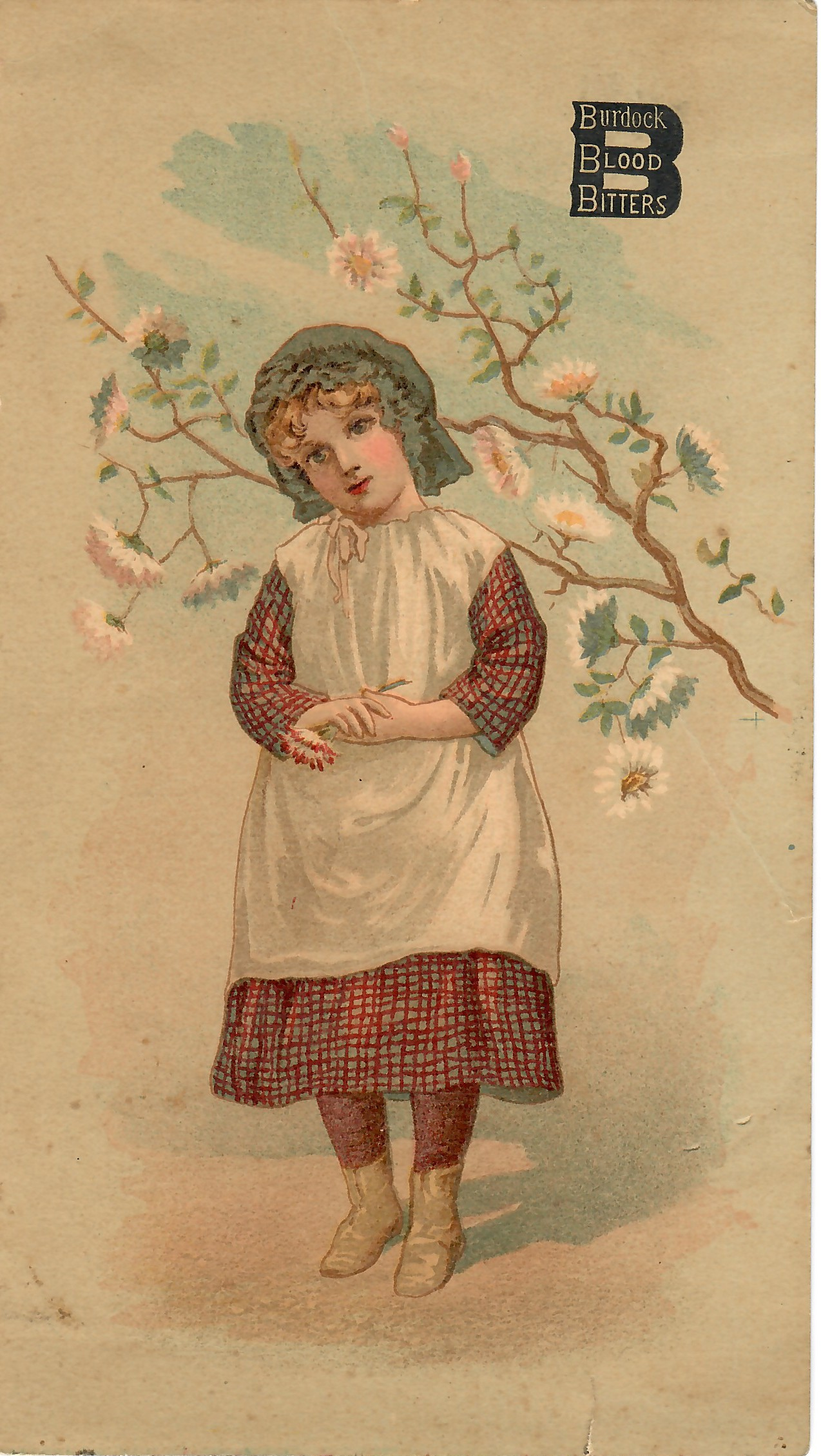 Antique Burdock Blood Bitters lithographed trade card with child illustration and advertising text.