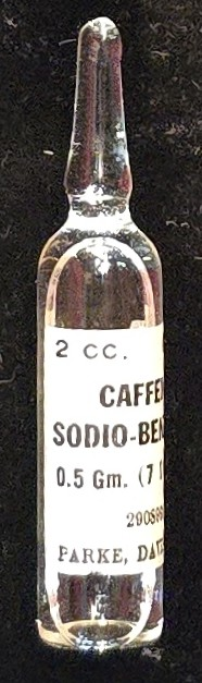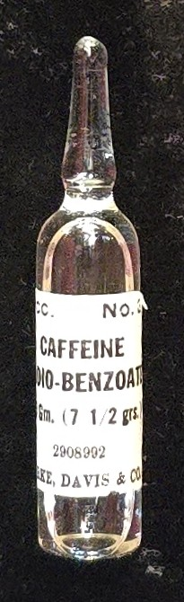 Parke, Davis & Co., founded in 1866 in Detroit, was one of the largest American pharmaceutical companies of the late 19th and 20th centuries. Their products included vaccines, antiseptics, narcotics, and stimulants like caffeine sodio-benzoate. Injectable caffeine preparations were especially popular in the early to mid-20th century before safer, more effective stimulants and migraine treatments replaced them.
