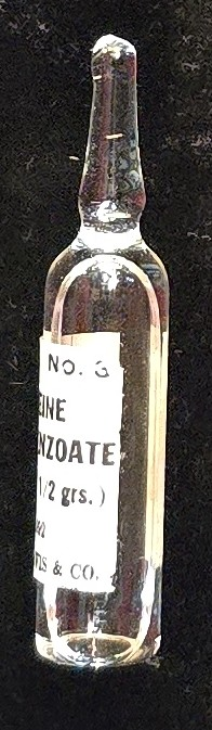 This is a vintage glass ampoule of Caffeine Sodio-Benzoate (Caffeine Sodium Benzoate), produced by Parke, Davis & Co., Detroit. The label indicates a 2 cc sterile solution, with a dosage of 0.5 gm (7 ½ grains) per ampoule. Caffeine sodio-benzoate was once a widely used injectable stimulant, administered for conditions such as migraine, respiratory depression, circulatory collapse, and even to counteract sedative overdose. The compound combined caffeine with sodium benzoate to improve solubility for parenteral use.