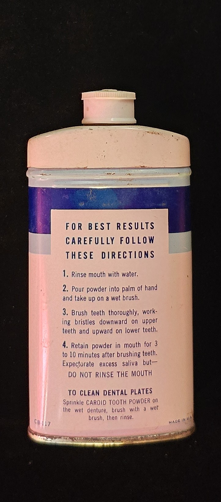 Caroid Tooth Powder illustrates a period of medical confidence in enzymatic solutions and chemical intervention in everyday health practices. It represents how scientific enthusiasm translated directly into daily routines, sometimes with instructions that feel startling by modern standards. As a complete, well-preserved example of mid-century dental therapeutics, it earns its place as a tangible reminder of how oral hygiene once blurred into medical treatment.