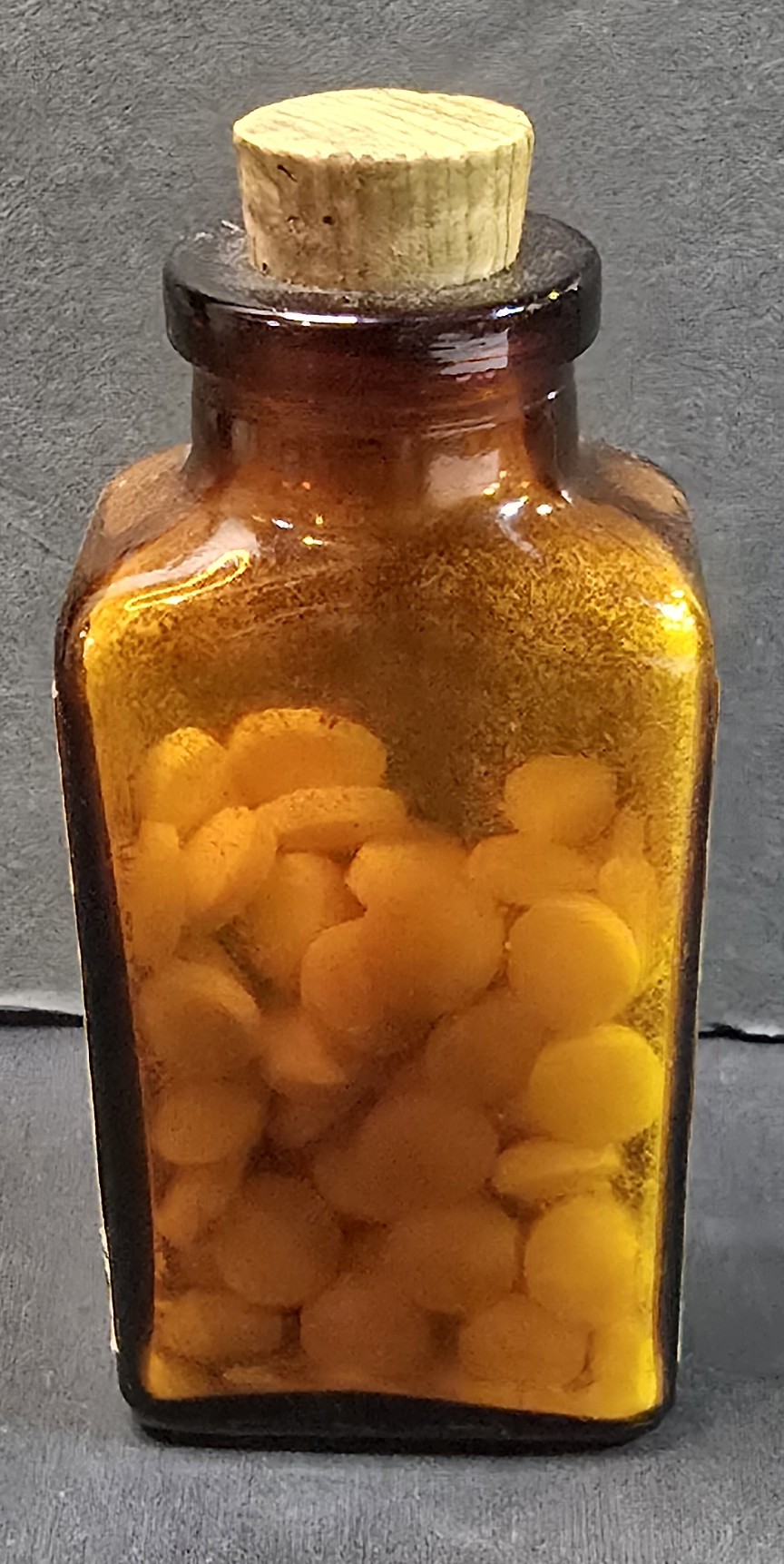 Original amber glass bottle with intact cork stopper; label present and legible with expected edge wear, light scuffing, and age toning. Tablets remain inside. No structural damage noted.