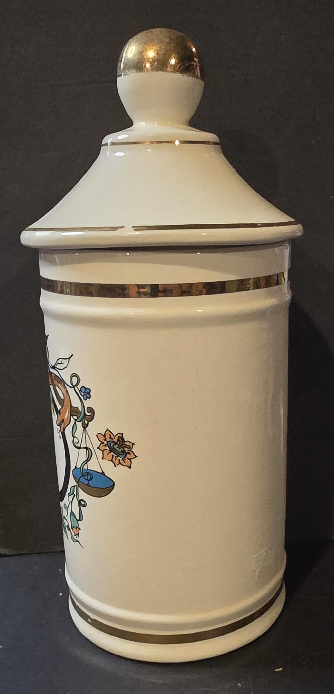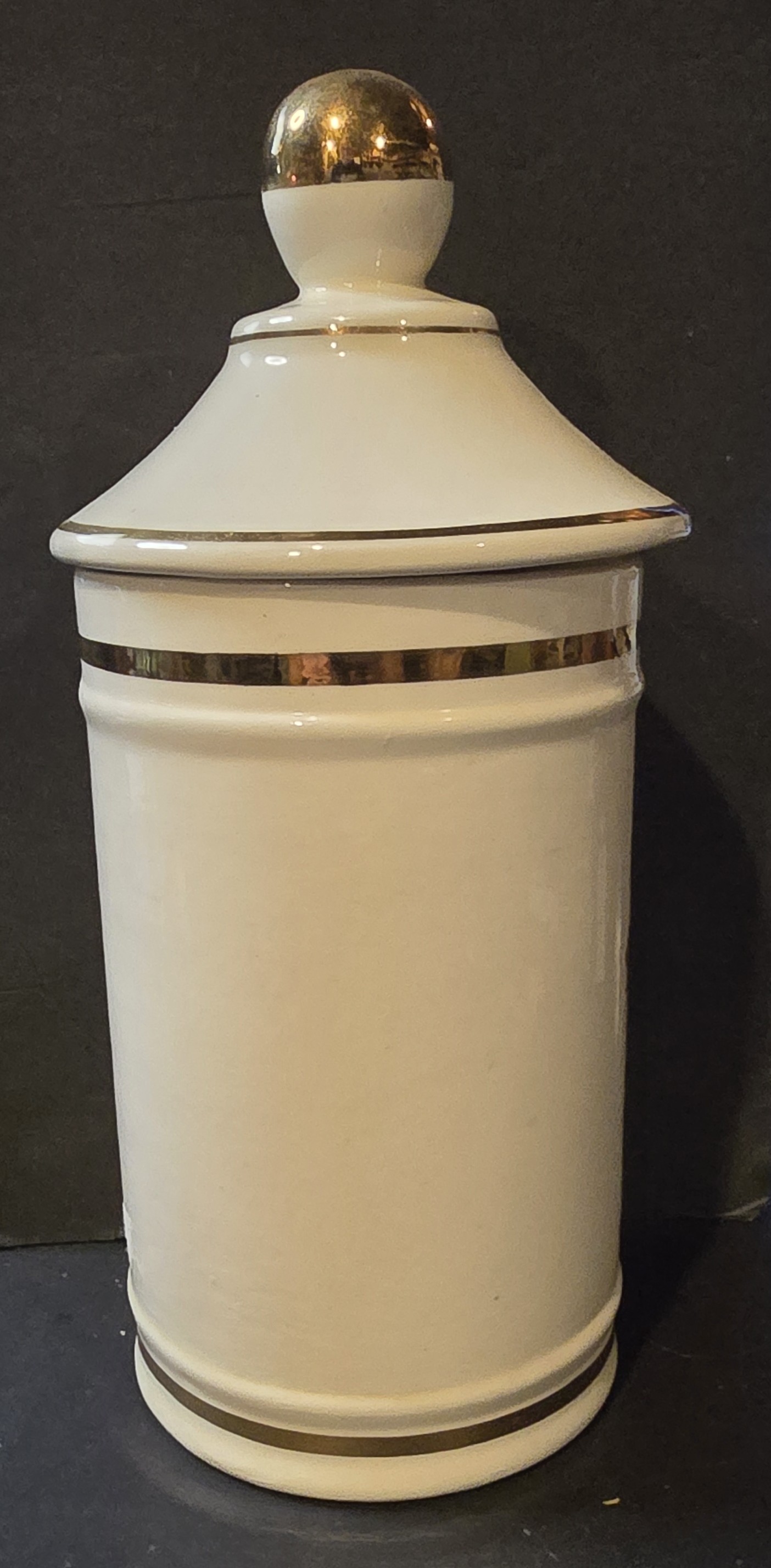 The jar features a cylindrical white-glazed body with an ornate polychrome cartouche, gilt accents, and a matching domed lid topped with a gilded finial. Decorative bands and classical pharmacy ornamentation reflect late 19th-century European apothecary aesthetics, where function and visual authority were inseparable.