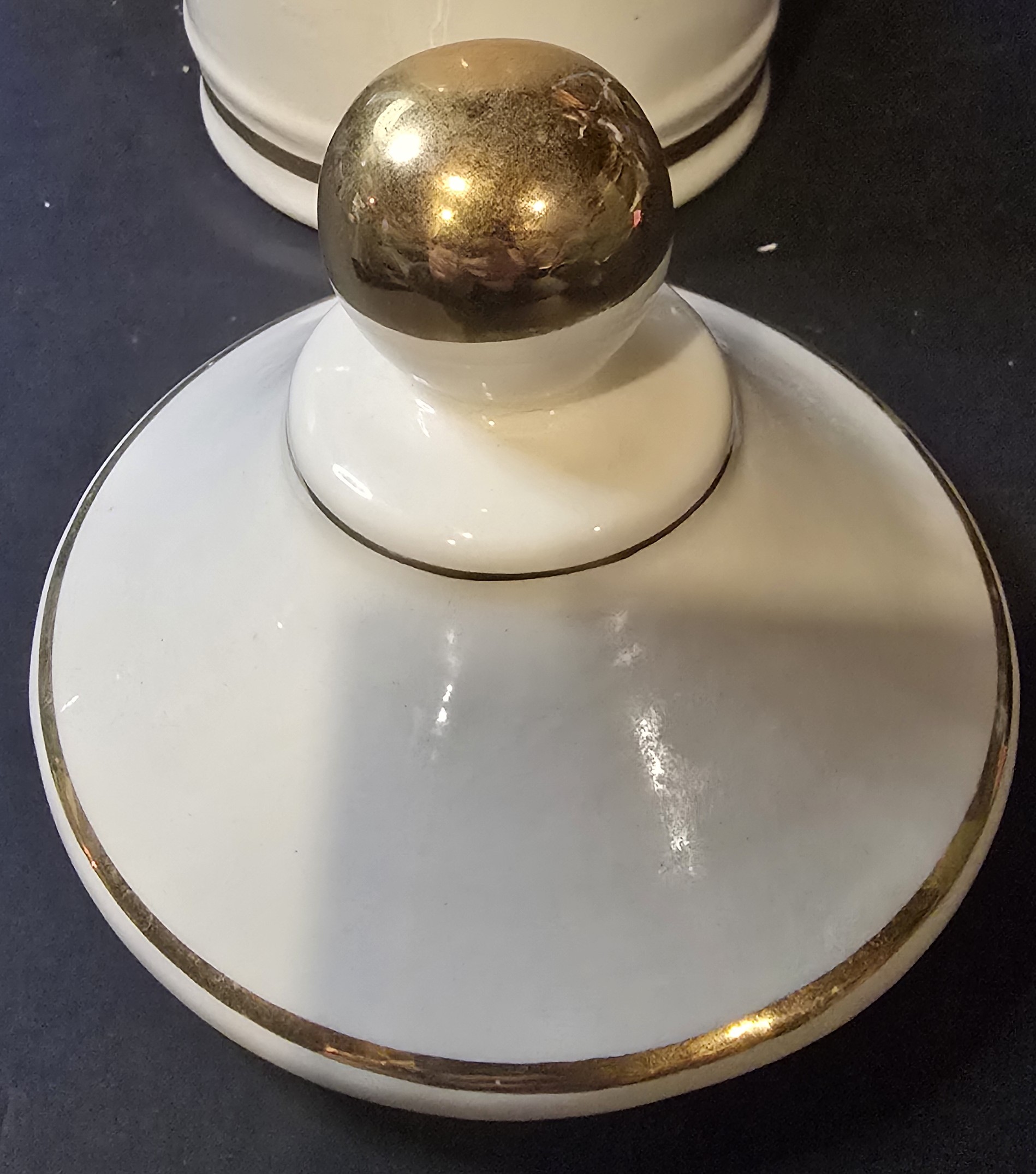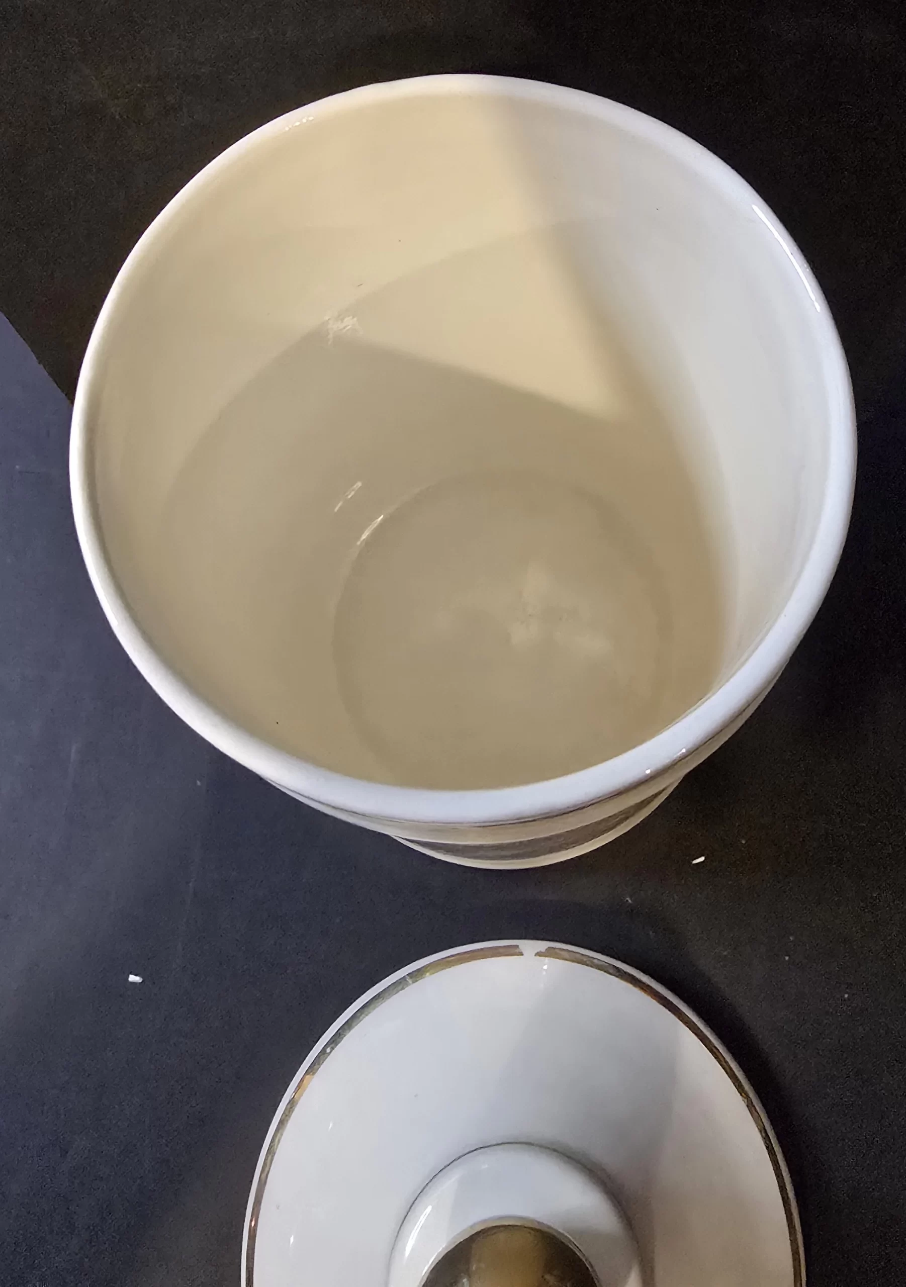 Porcelain body is intact with no visible cracks or repairs. Glaze remains glossy with minor surface wear and light scuffing consistent with age and handling. Gilt trim shows expected wear and thinning, particularly along rims and finial. Interior is clean with light discoloration consistent with historic storage. Lid fits properly. Overall condition is very good, display-grade, with honest age-related wear.