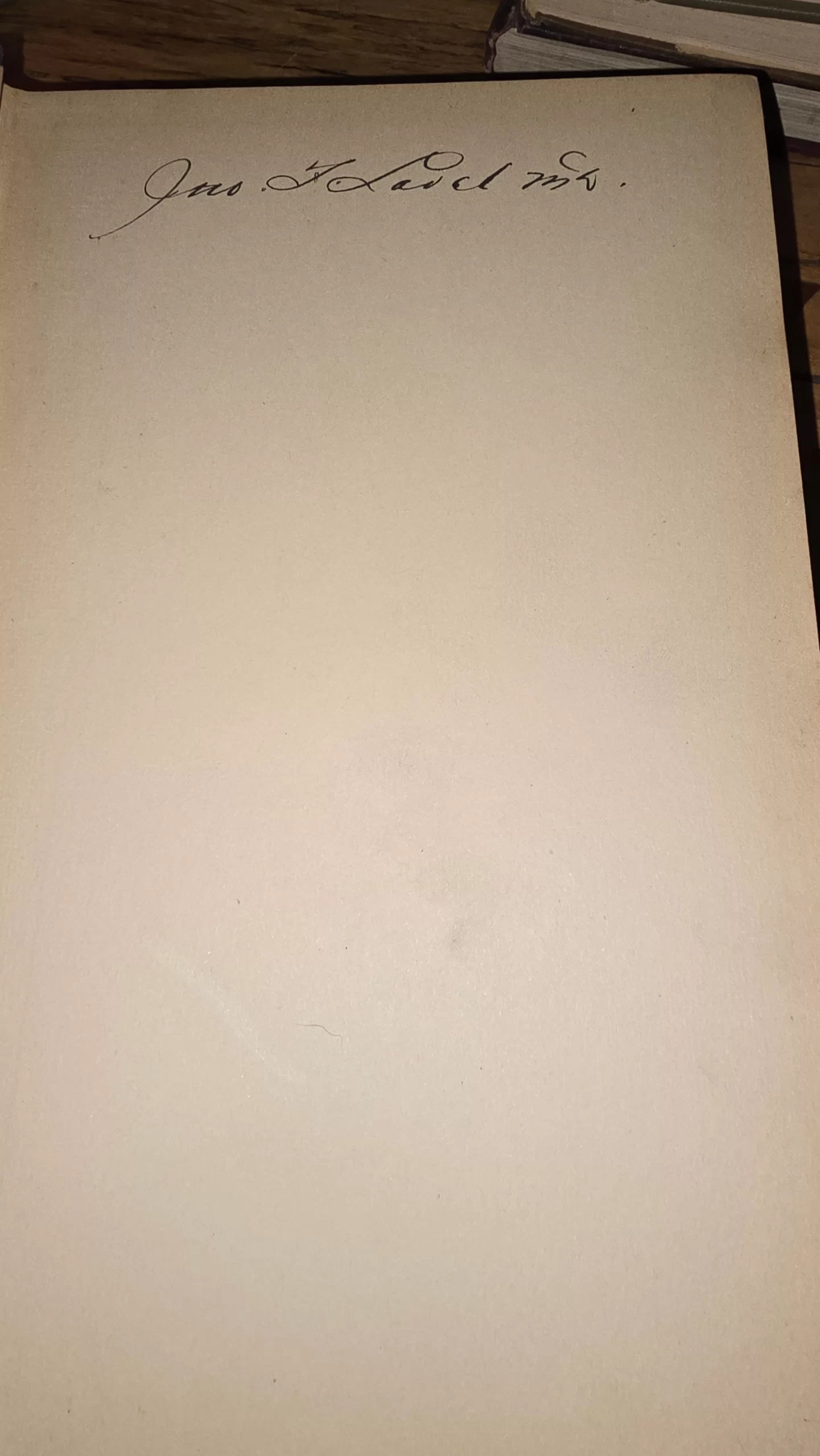 Purple cloth hardcover with edge wear and some fading. Paper spine label is intact but stained and yellowed with age. Inner flyleaf bears the signature “Jno H. Ladd M.D.” suggesting a prior owner. Interior pages are clean, with slight toning. Binding remains sound.