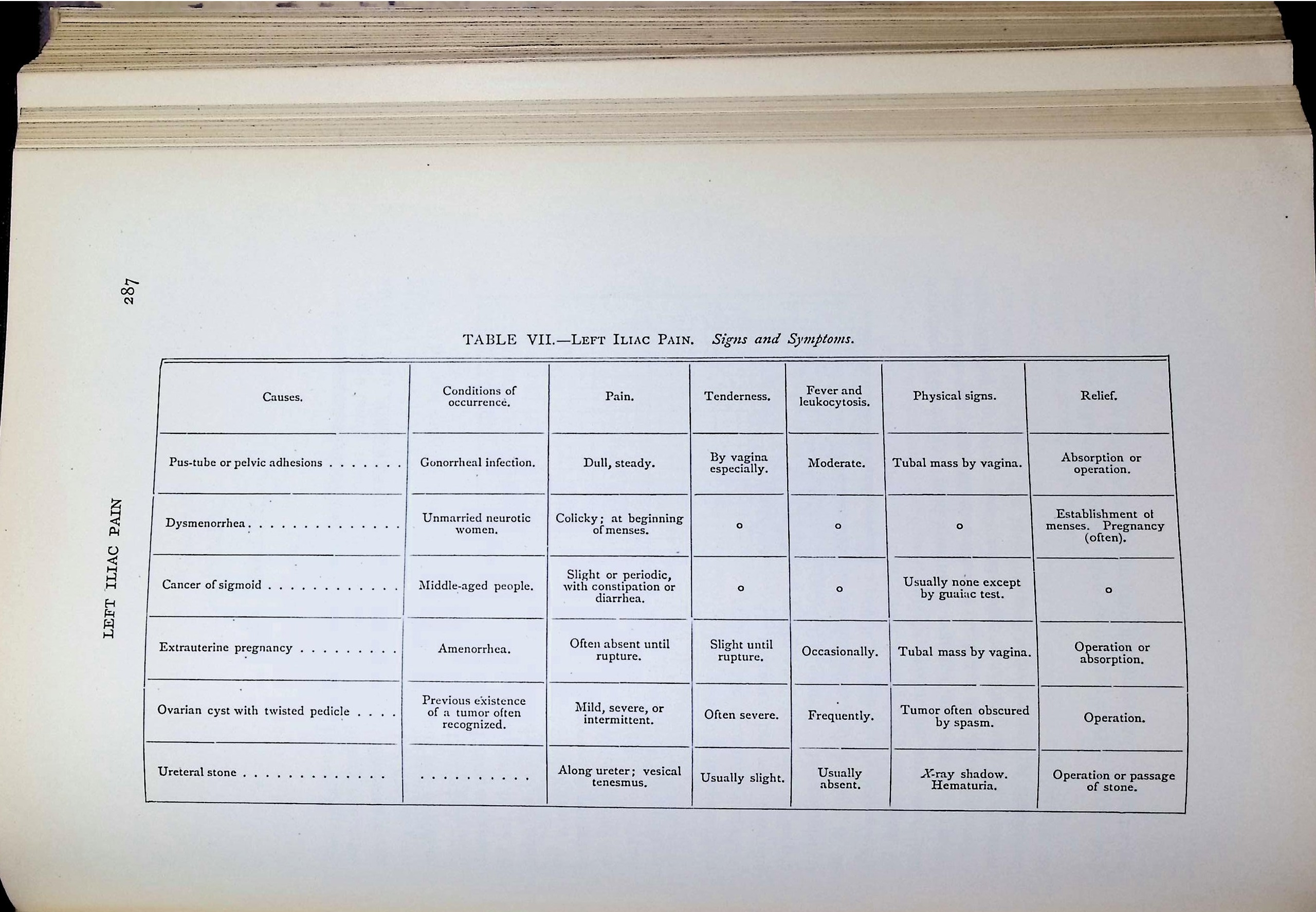 • Tables such as “Left Iliac Pain” include symptom associations like “unmarried neurotic women” under dysmenorrhea—a revealing look at the gendered medical language of the period.