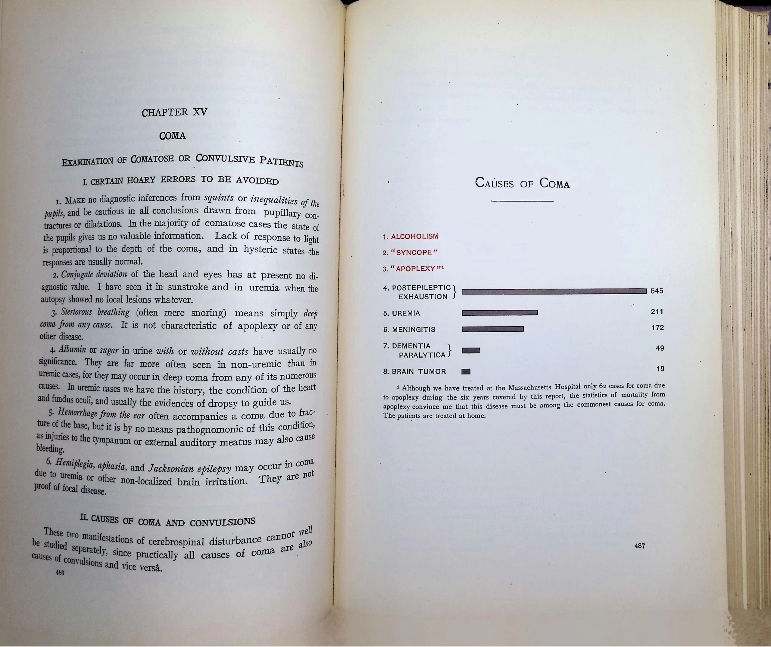 • This edition includes a comparative bar chart showing postepileptic exhaustion as the leading recorded cause of coma—more than meningitis or uremia.