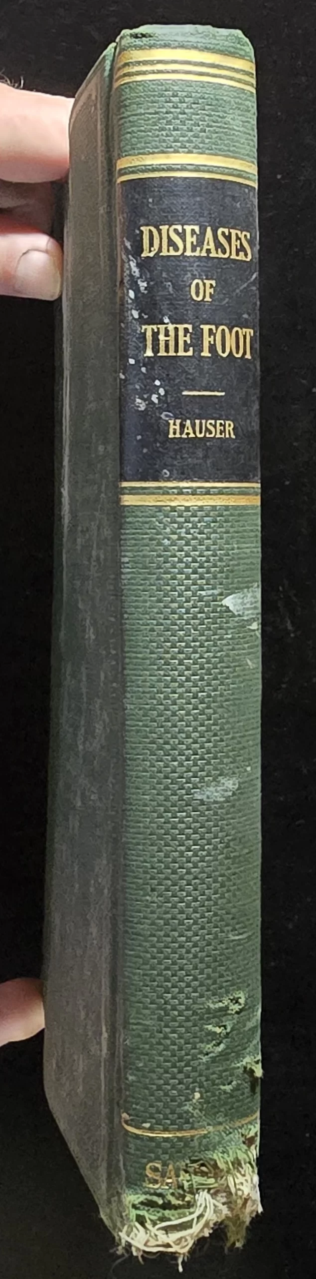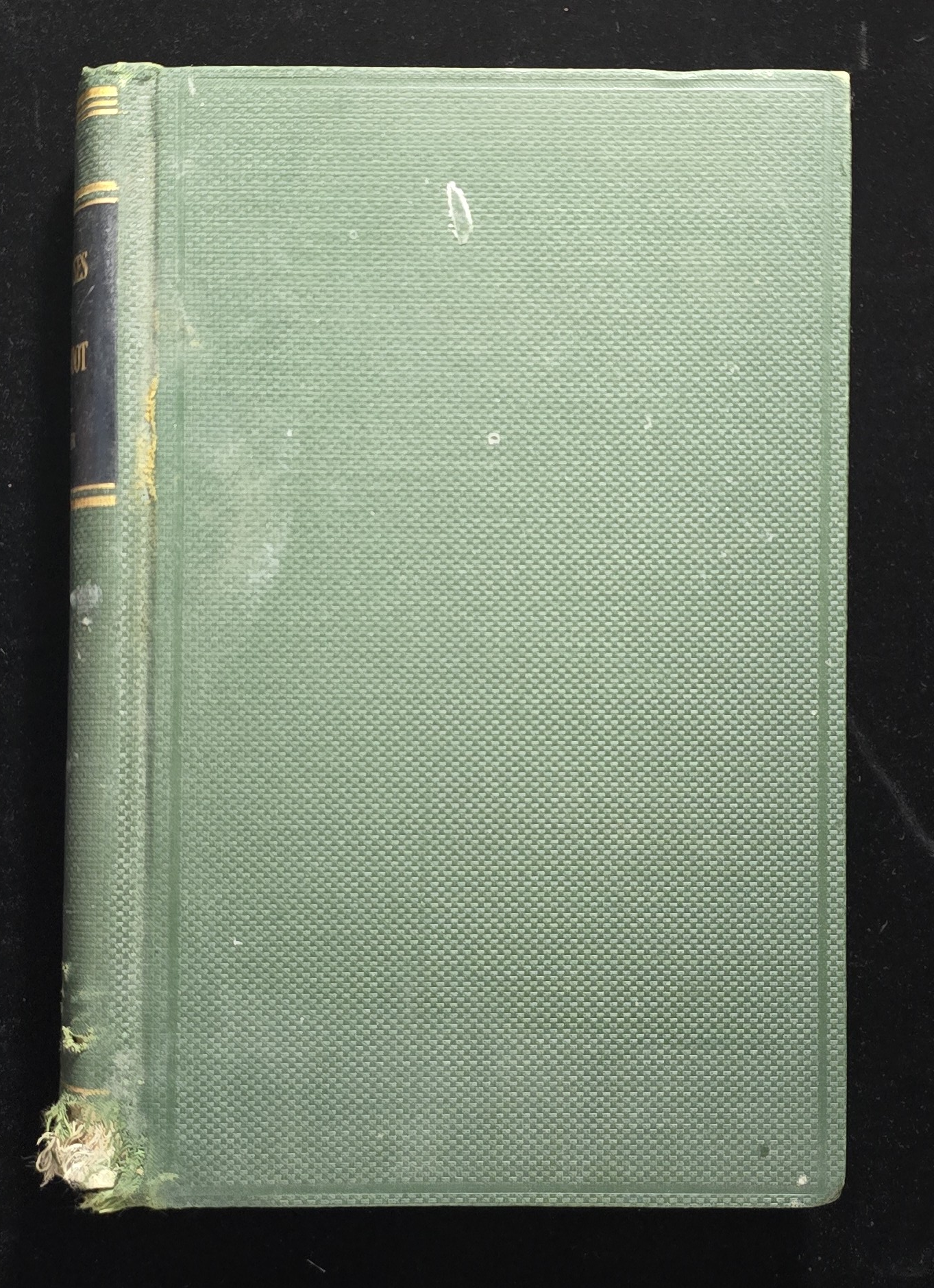 Cover: Green cloth hardcover with moderate edge wear and heavy fraying at the tail of the spine