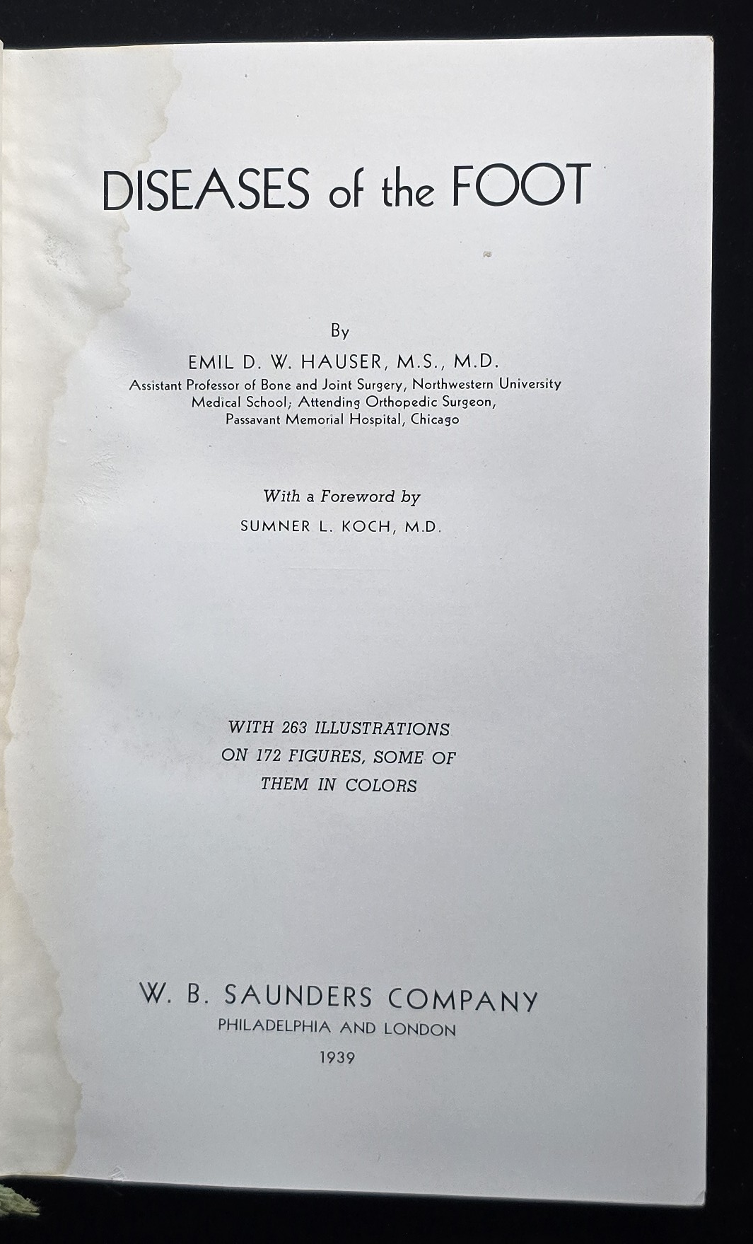 This 1939 medical textbook, Diseases of the Foot, was authored by Emil D. W. Hauser, M.S., M.D., Assistant Professor of Bone and Joint Surgery at Northwestern University Medical School and Attending Orthopedic Surgeon at Passavant Memorial Hospital in Chicago. With a foreword by Sumner L. Koch, M.D., the book includes 263 illustrations across 172 figures, some in color, to assist in the diagnosis and treatment of foot disorders.