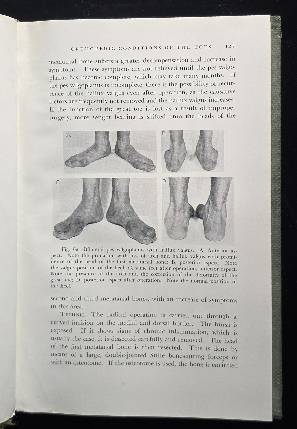 “Note the pronation with loss of arch and hallux valgus with prominence of the head of the first metatarsal bone… Note the presence of the arch and the correction of the deformity of the great toe… The radical operation is carried out through a curved incision on the medial and dorsal border… This is done by means of a large, double-jointed Stille bone-cutting forceps or with an osteotome.”