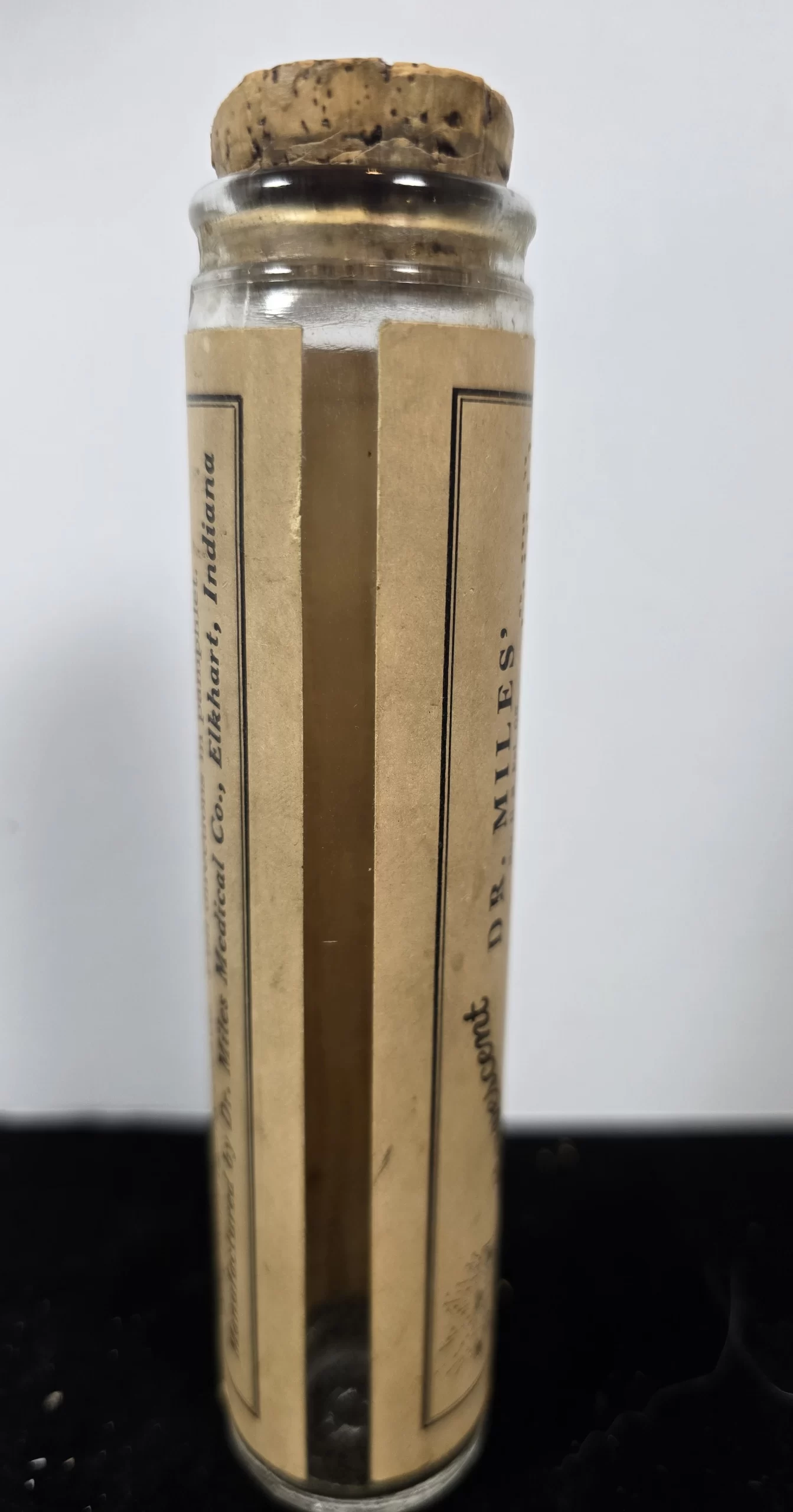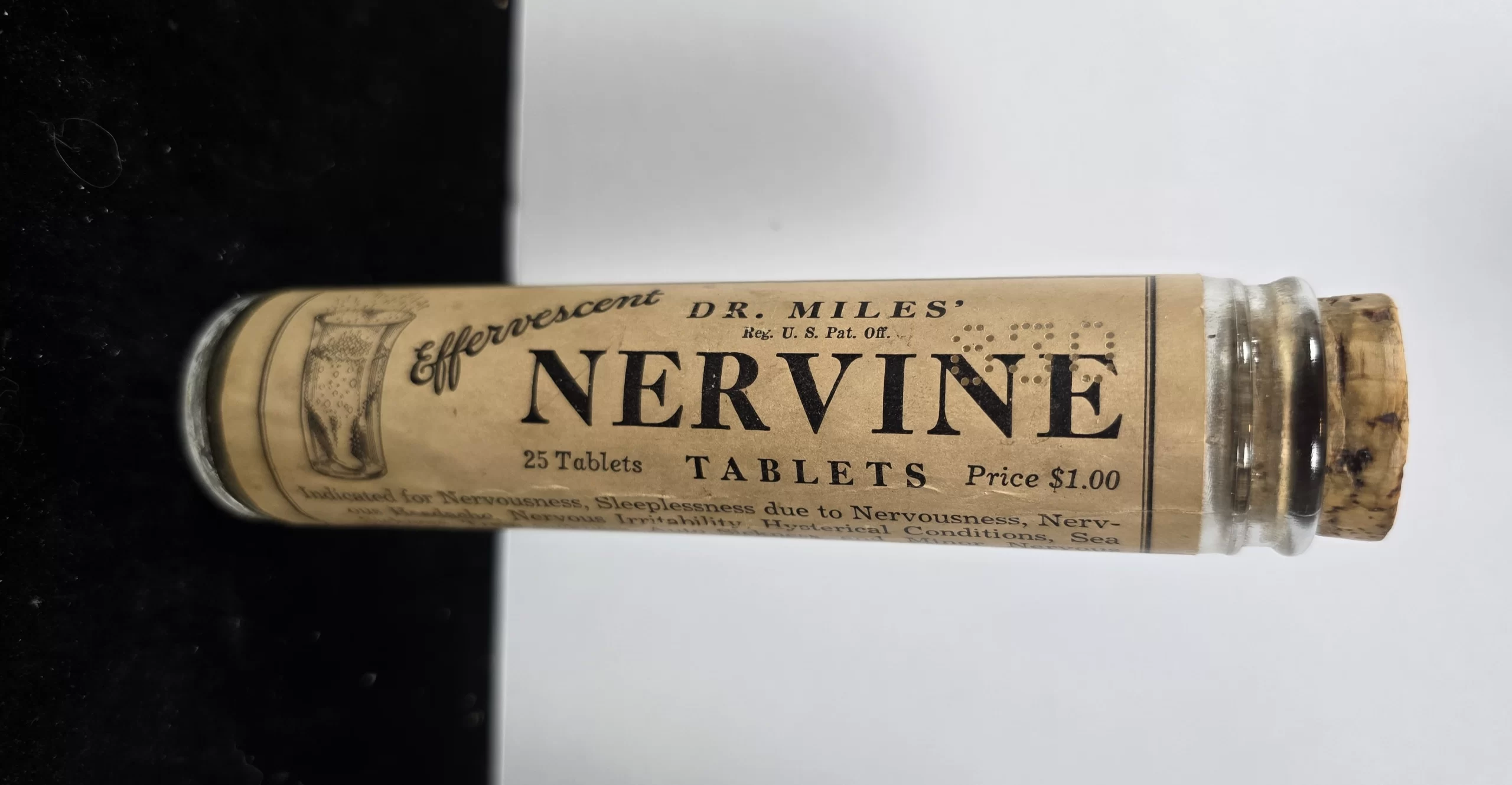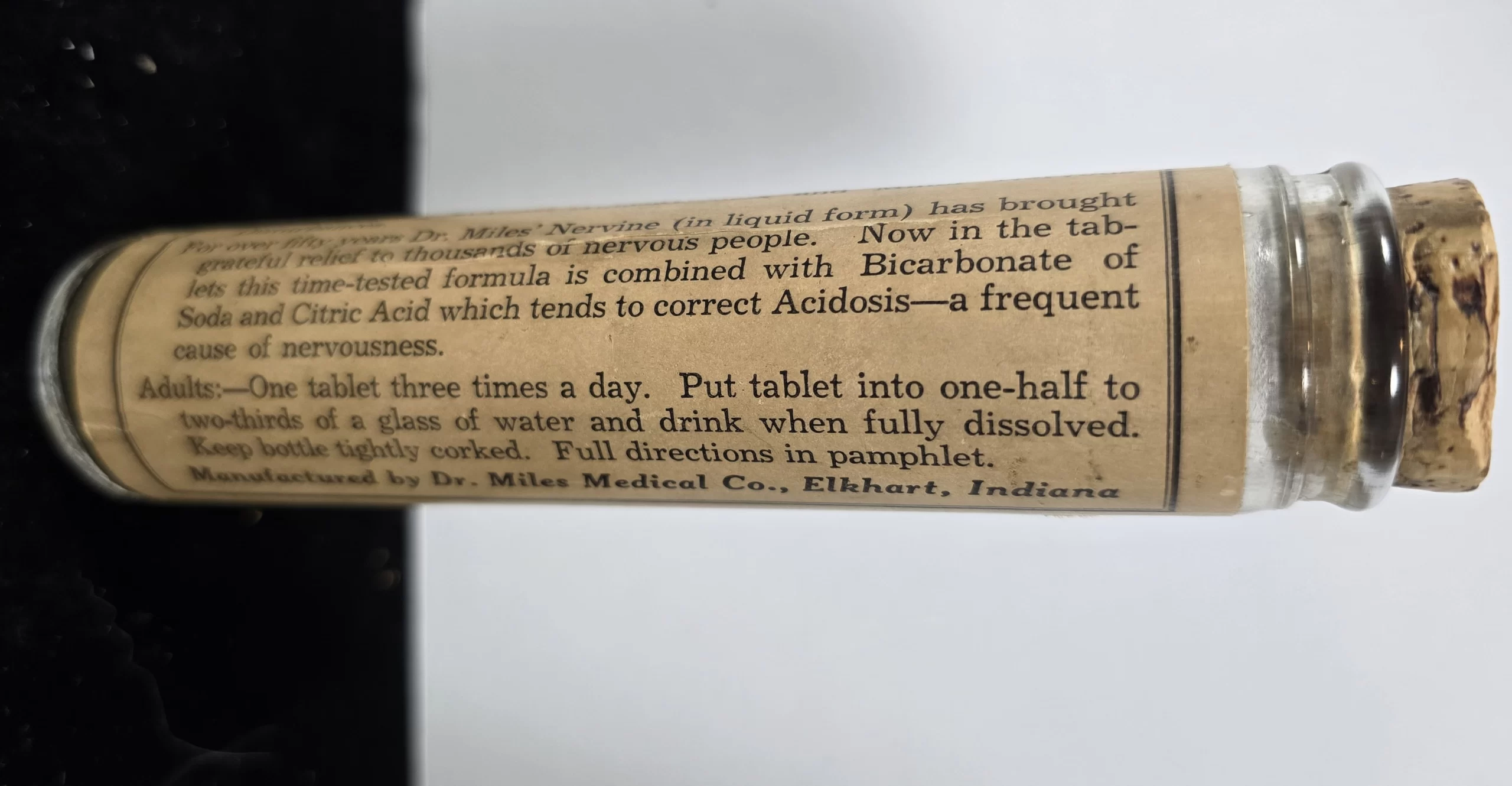 Original glass bottle of Dr. Miles’ Effervescent Nervine Tablets containing the full paper label and cork closure. Marketed as a remedy for “nervousness, sleeplessness, hysterical conditions, and sea or train sickness,” this early-20th-century product was part of the long-running Nervine line produced by the Dr. Miles Medical Company of Elkhart, Indiana. Each tube originally contained 25 effervescent tablets to be dissolved in water, advertised as a modernized form of the liquid “Dr. Miles’ Nervine” that had been sold since the 1880s. The effervescent version claimed to combine the time-tested formula with bicarbonate of soda and citric acid to “correct acidosis—a frequent cause of nervousness.”