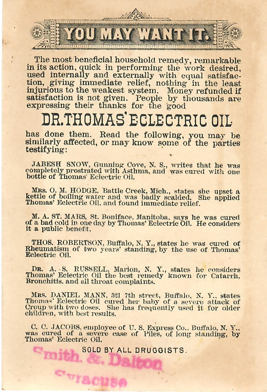 Dr. Thomas’ Eclectric Oil was marketed throughout North America in the late 19th century by Foster, Milburn & Co. of Buffalo, N.Y.