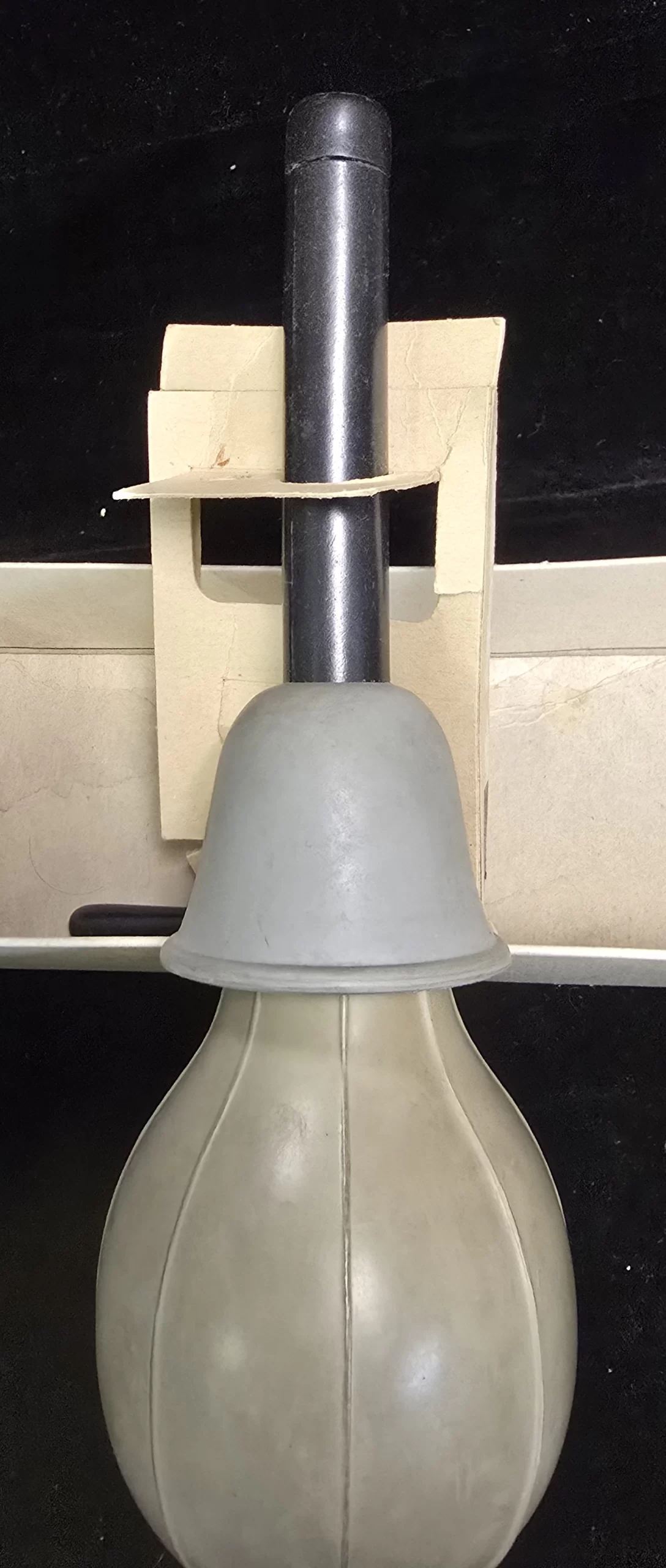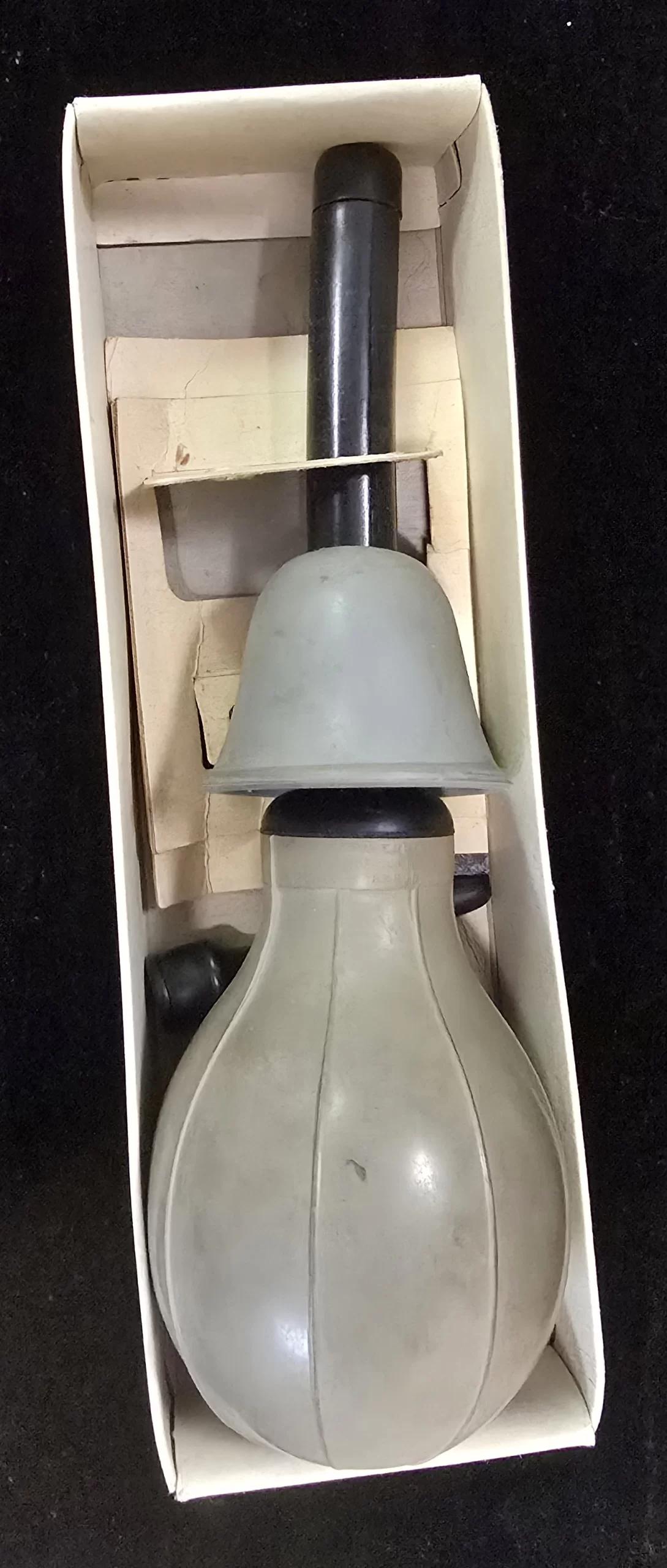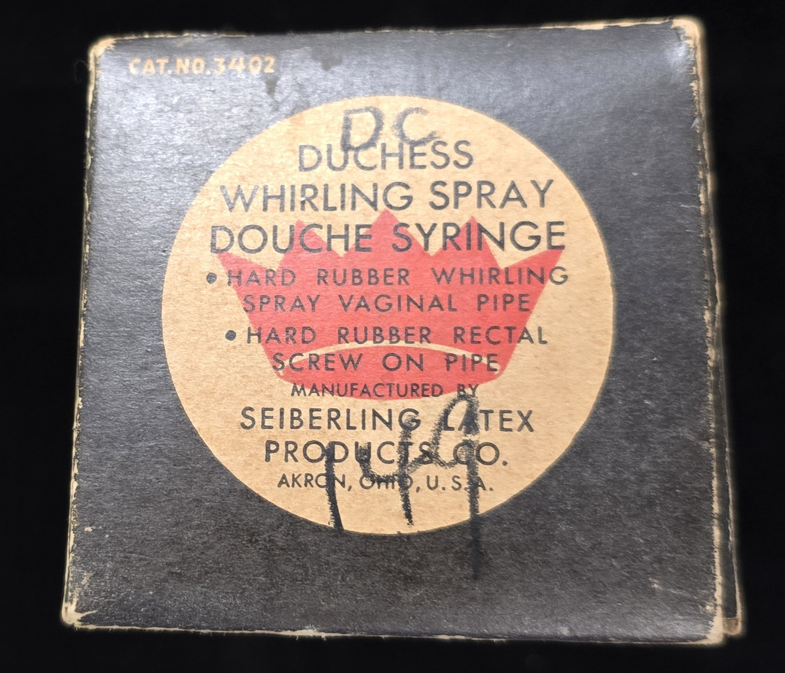 This boxed “Duchess” whirling spray douche and rectal syringe is a mid-20th century rubber irrigation device designed for both vaginal and rectal use. The set consists of a large compressible rubber bulb reservoir, a rigid black nozzle assembly, and interchangeable hard rubber pipes intended for different anatomical applications.