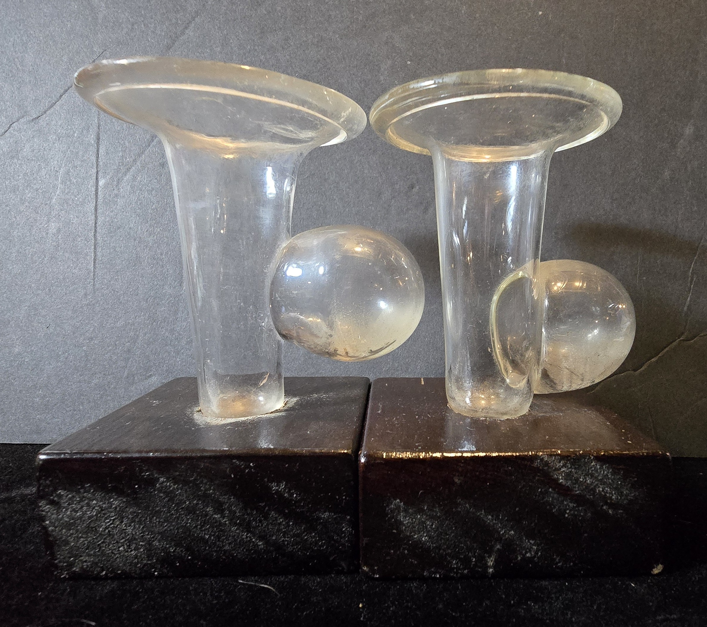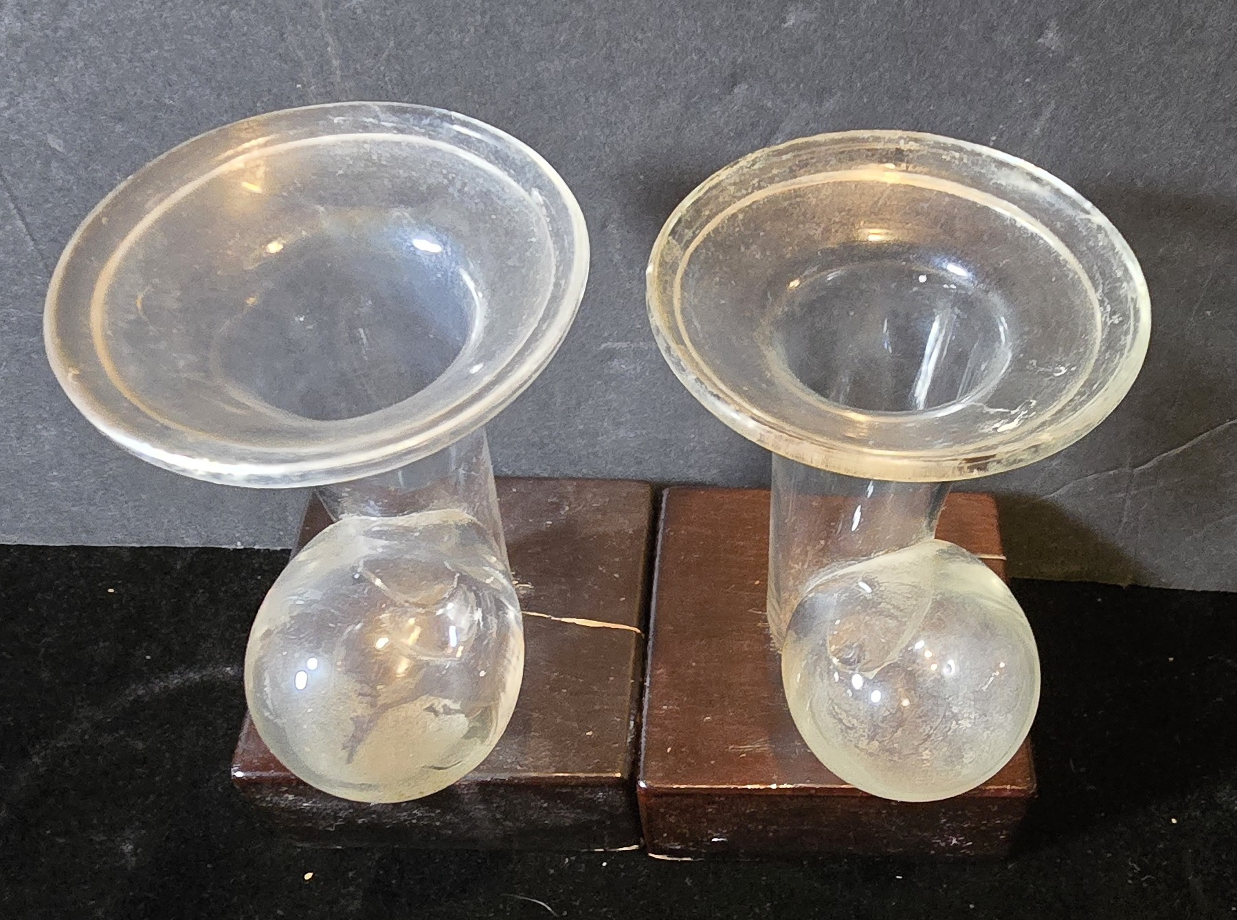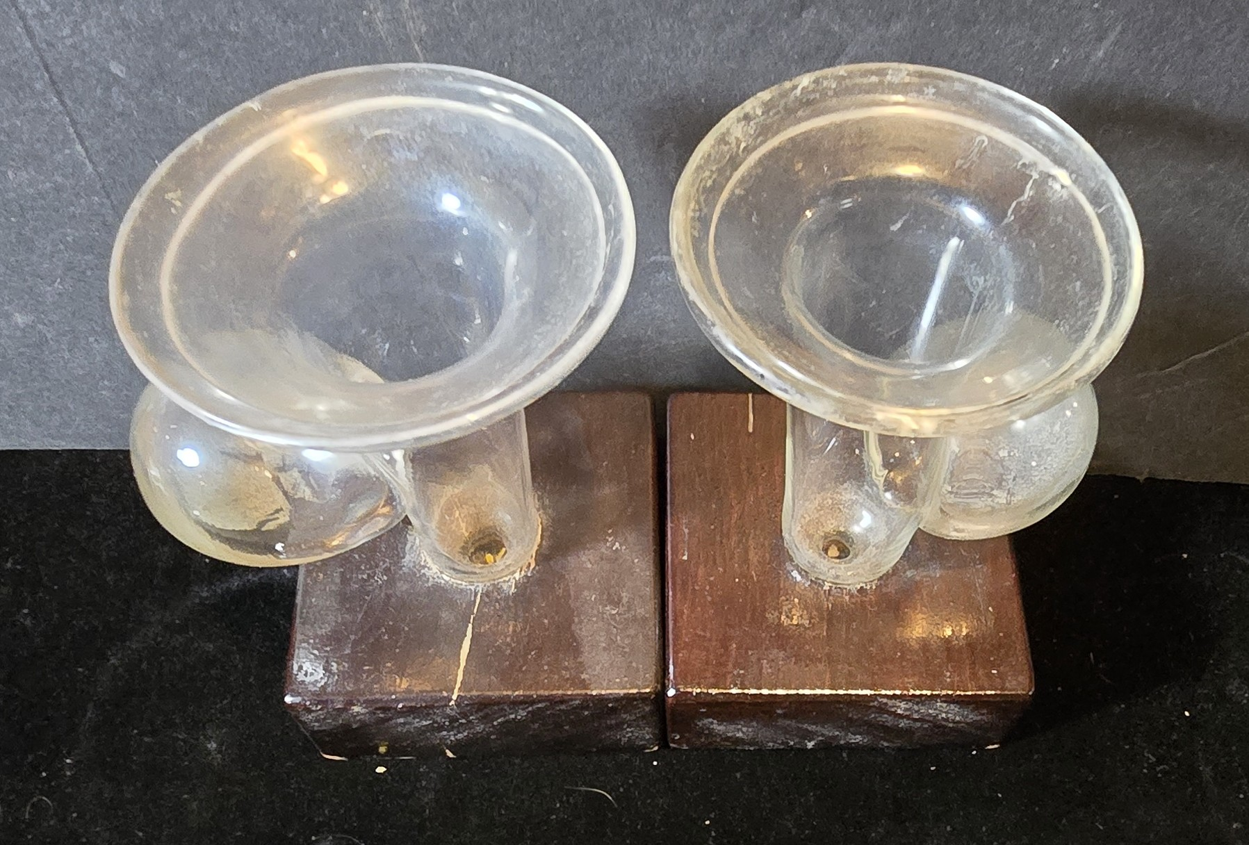 Matched pair of hand-blown glass breast collectors: each has a wide funnel (breast shield) and an integrated oval bulb reservoir positioned below/behind the shield to catch expressed breast milk. The hollow stem passes through the display base; historically, this stem connected to rubber tubing and a hand bulb that supplied intermittent suction. Milk drawn through the funnel drained by gravity into the attached glass bulb, which served as the collection chamber. Thick, slightly wavy glass with scattered air bubbles—typical of early 20th-century hospital/physician supply.