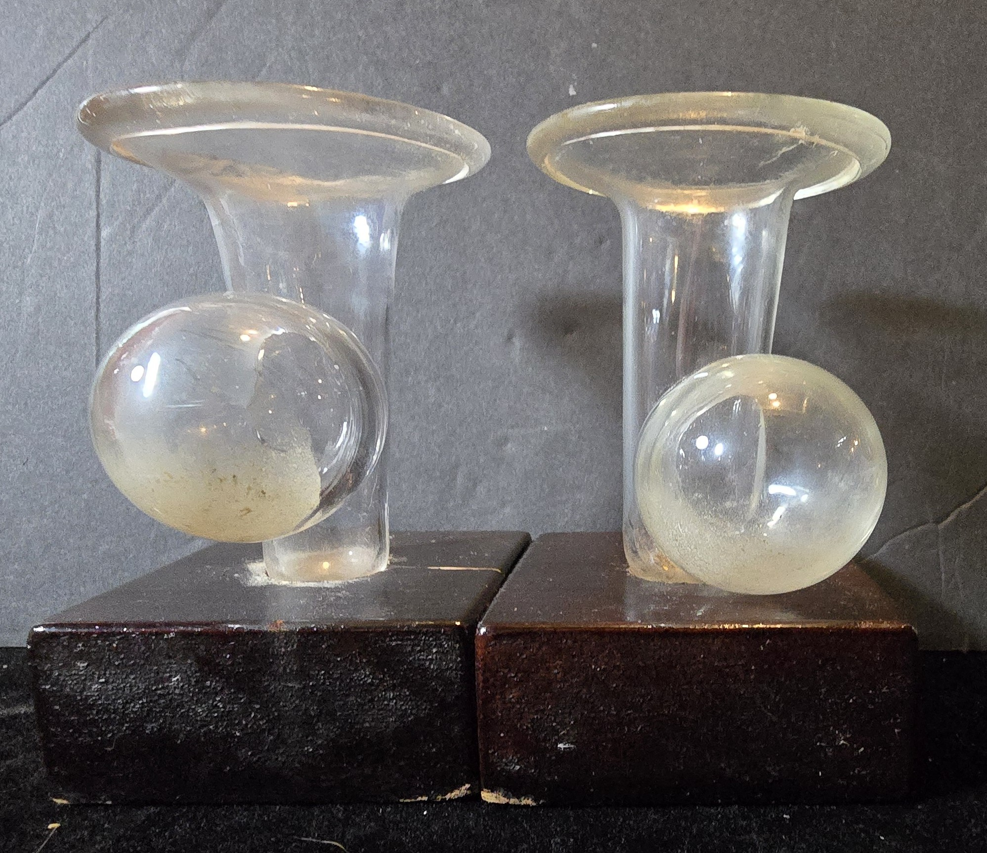 Good for age: light internal haze/residue in bulbs, fine scratches, no structural cracks noted. Wooden bases are for display only and show scuffs and edge wear.