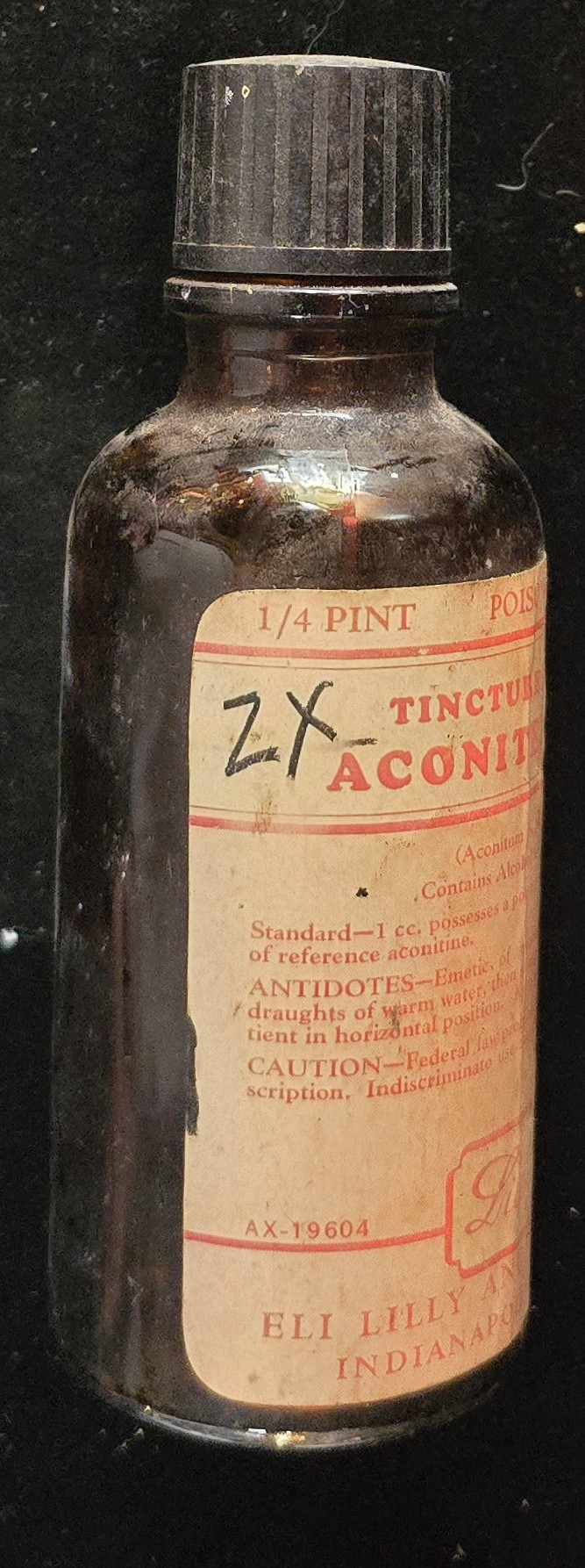 Antique Eli Lilly Tincture of Aconite poison bottle, 1/4 pint amber glass with original label.