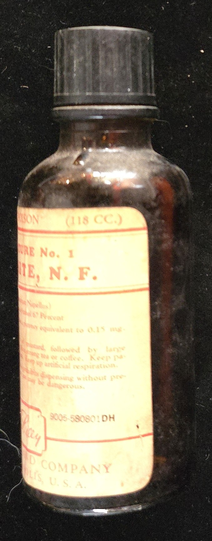 This brown glass pharmacy bottle once contained Tincture of Aconite, N.F., manufactured by Eli Lilly & Company of Indianapolis. The label prominently warns “POISON” and specifies its strength: 1 cc equal to 0.15 mg of reference aconitine. It contained aconitum napellus (monkshood), dissolved in 67% alcohol.