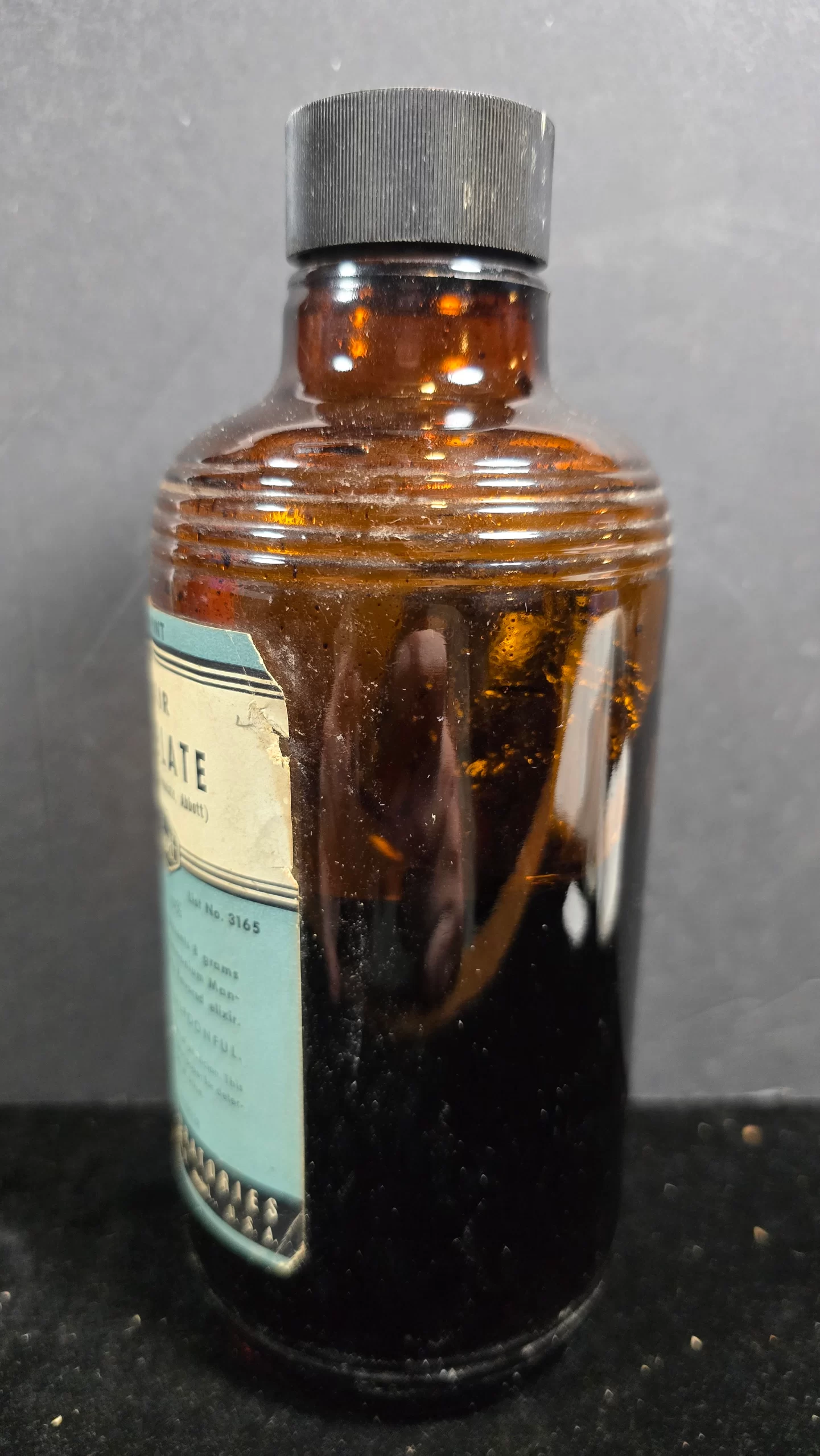 Original amber ribbed glass bottle with Abbott-marked screw cap. Label intact and legible with moderate edge wear, surface scuffing, and age toning. Glass shows expected age-related dusting and internal residue. Structurally sound with no cracks or chips observed.