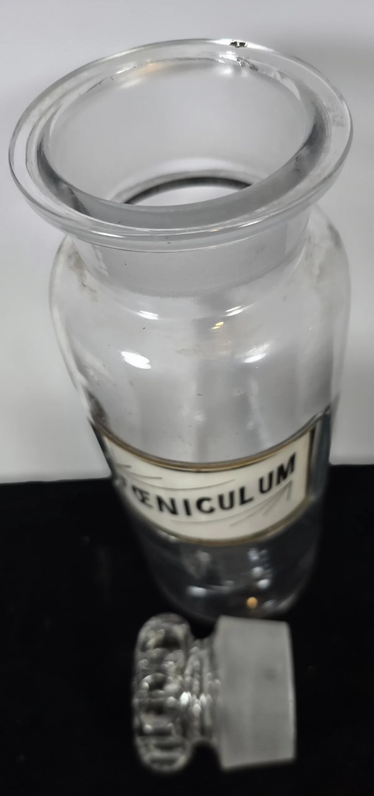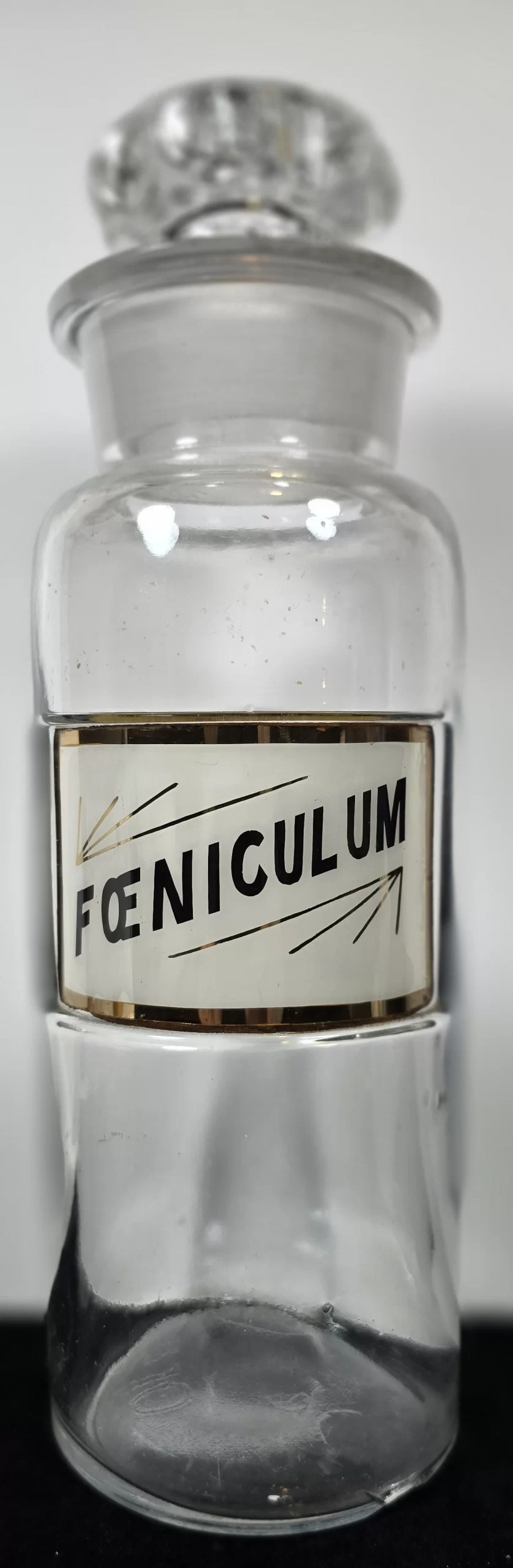 A beautifully preserved clear glass apothecary jar labeled “Fœniculum”, the Latin name for fennel.